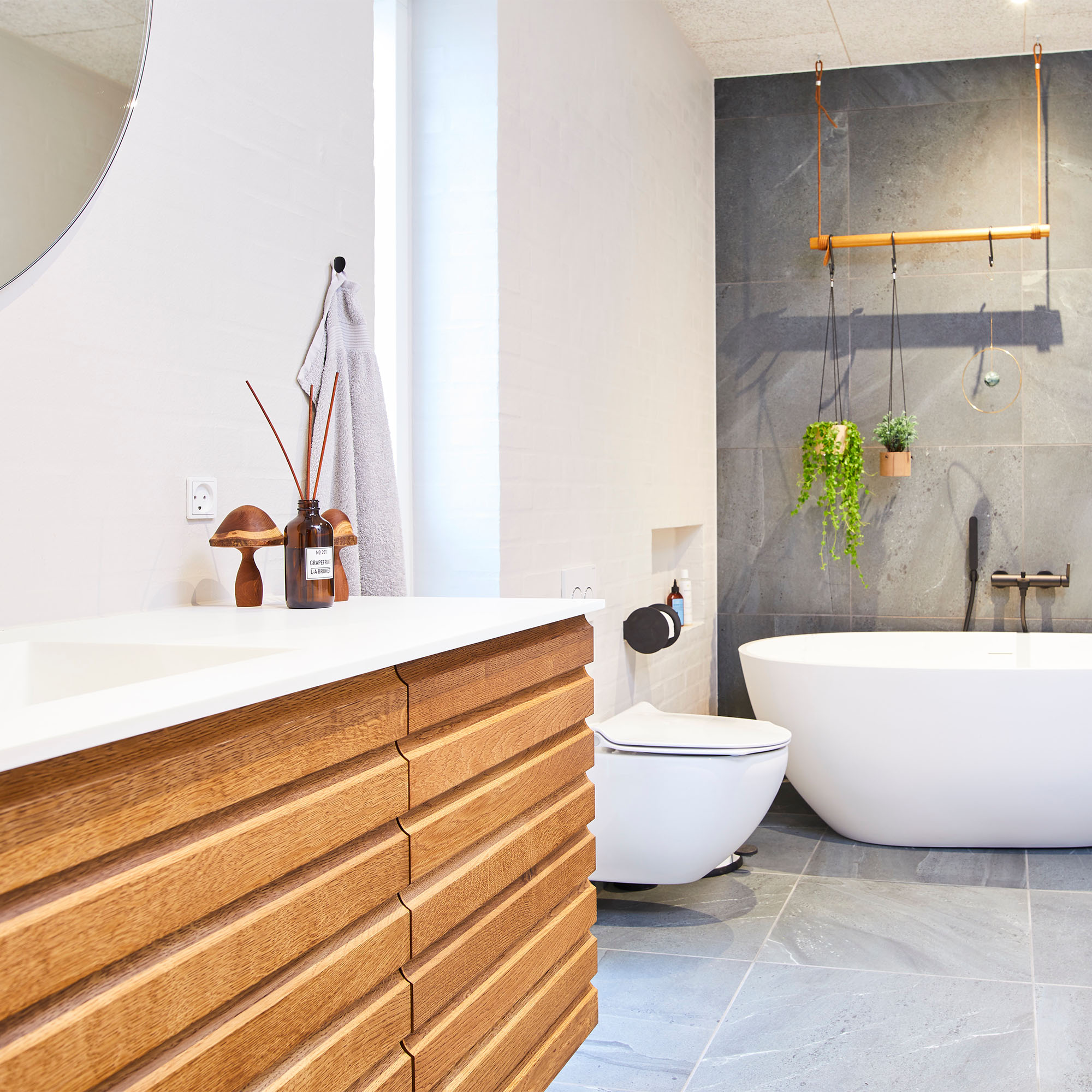 Hvordan kan du bruge fliser, træ og metal sammen? Vælg materialer, der komplementerer hinanden. Ved at lege med teksturer kan du tilføje karakter og personlighed til dit badeværelse. Det handler om at finde den rette balance mellem forskellige elementer for at skabe et harmonisk og indbydende rum.