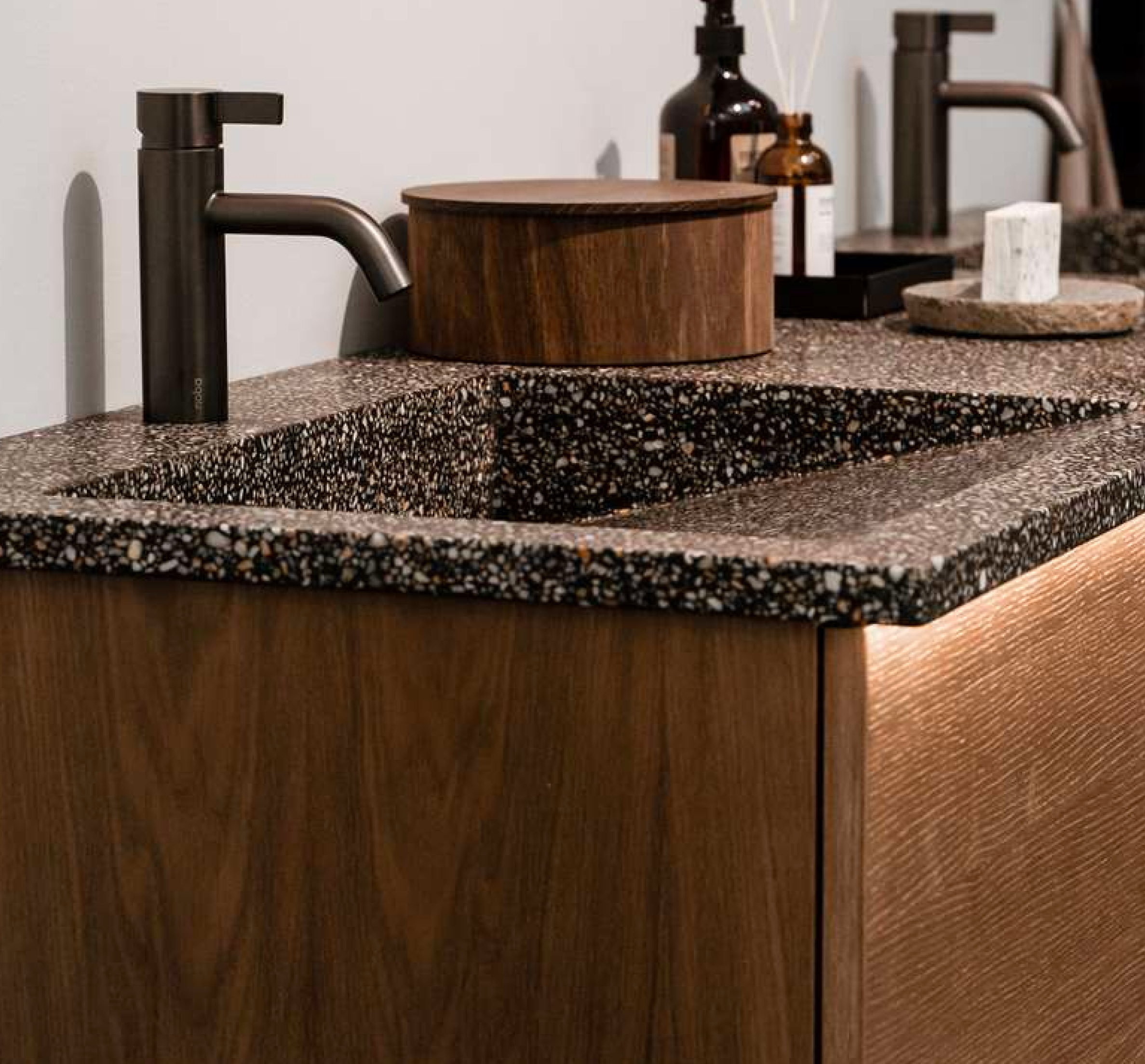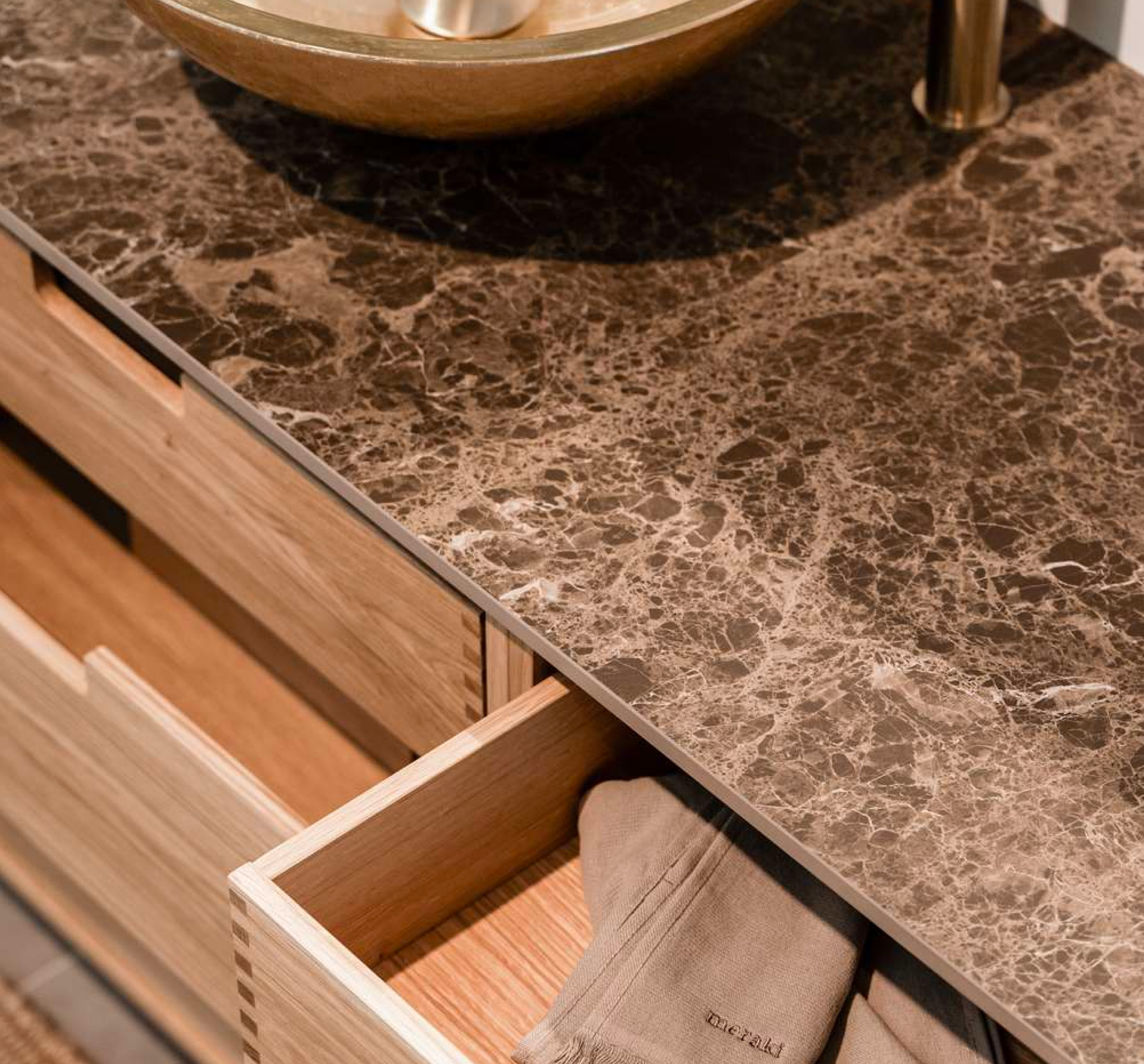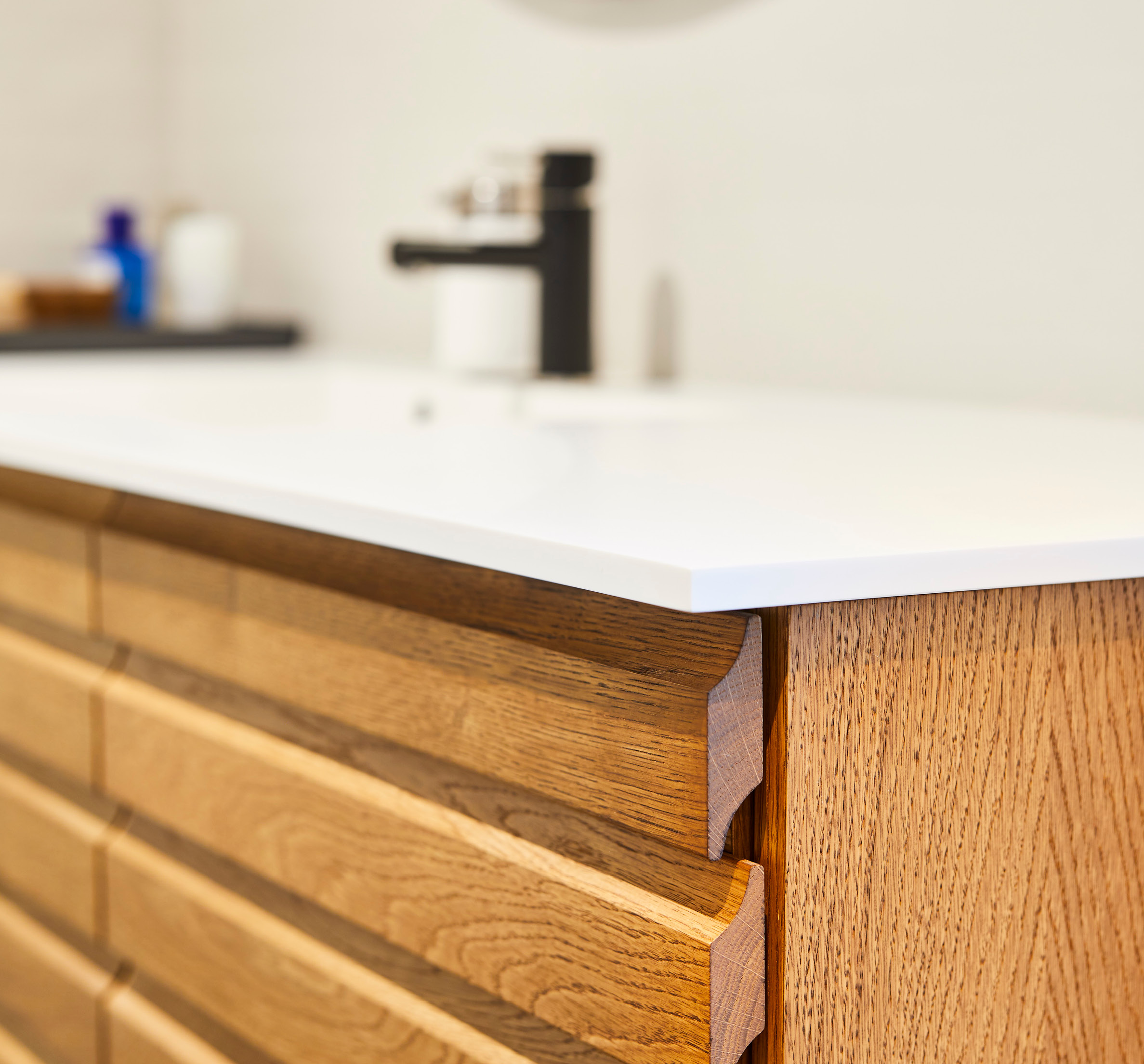 Vores bordplader til badeværelset er designet med fokus på naturlige materialer og rene linjer, der fremhæver rummets skønhed og skaber en varm atmosfære.