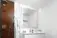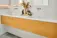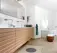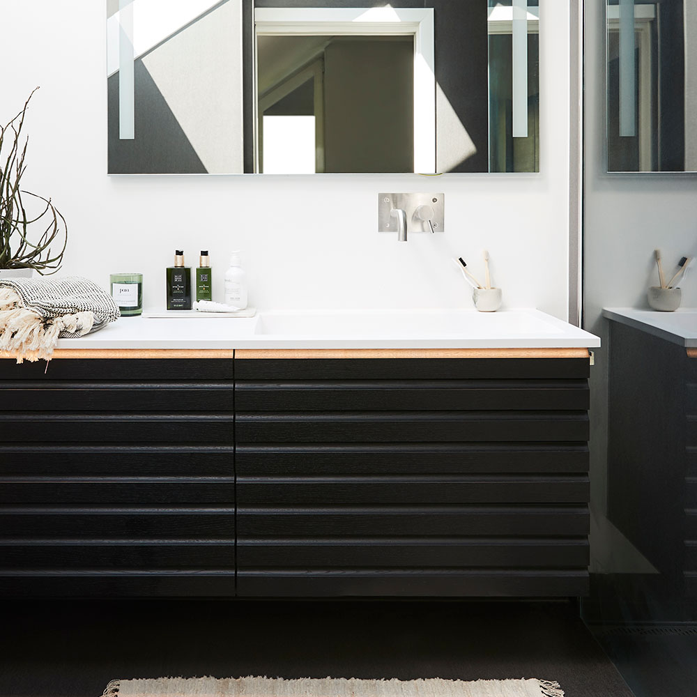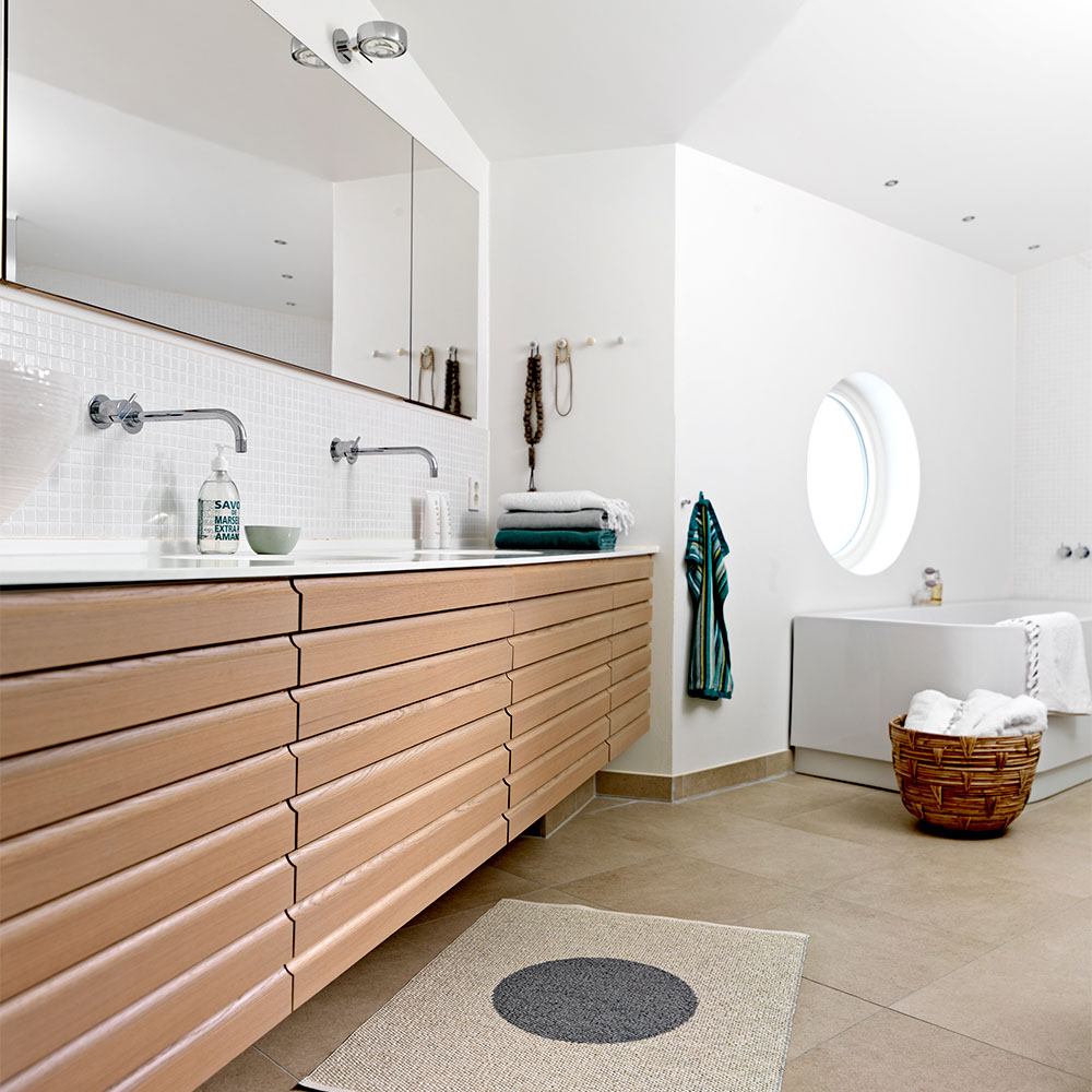 Fra badekarret kan familien nyde udsigten til den norske natur gennem det runde vindue. De funktionelle linjer fortsætter hen ad badeværelsets lange møbel med to håndvaske. Den travle familie har valgt to håndvaske så der ikke opstår trængsel omkring håndvasken. Med to håndvaske på badeværelset, side om side, kan man nemlig nyde morgenerne i ro og fred.