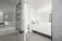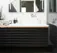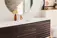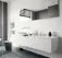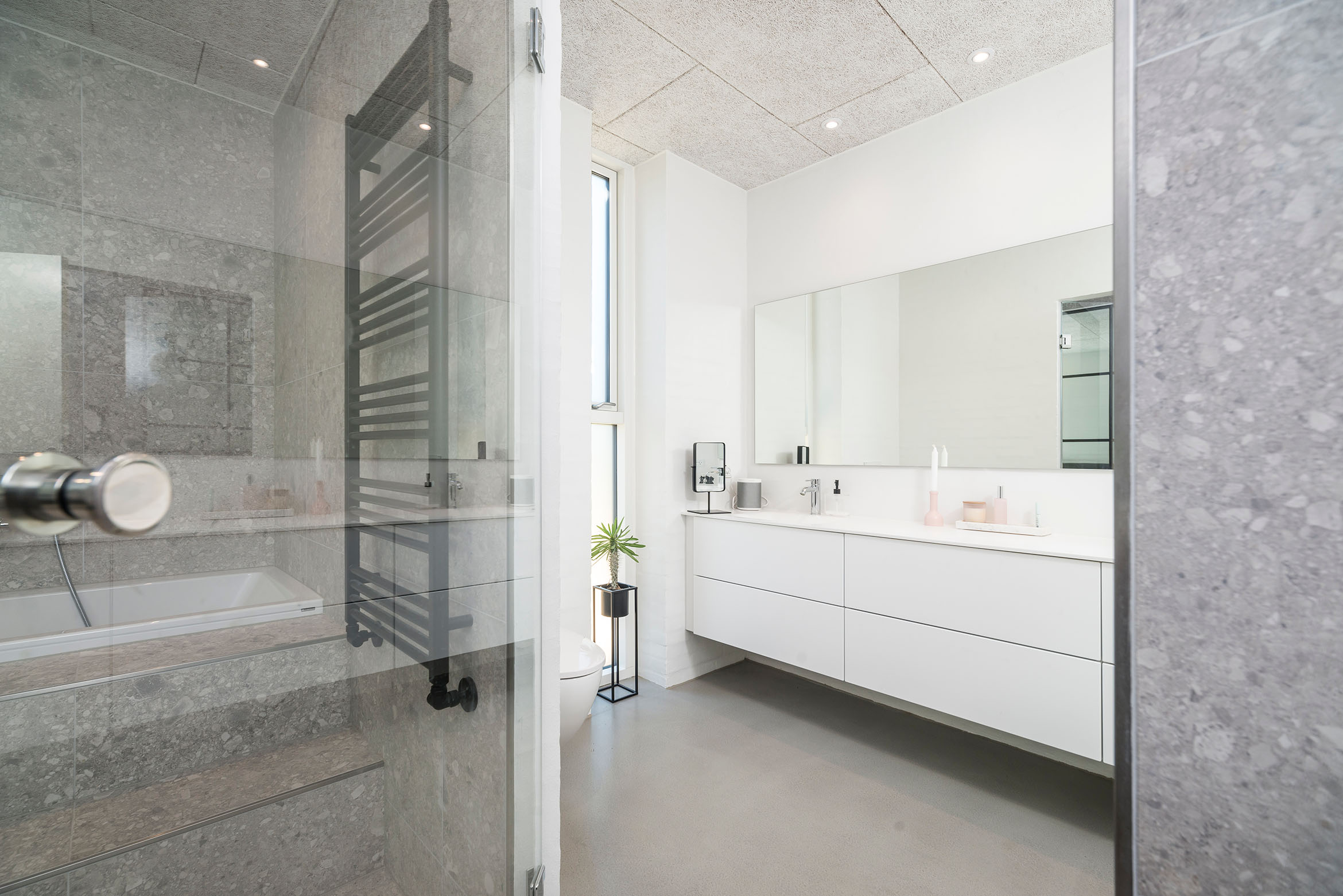Badeværelset er ingen undtagelse. Her træder man ind i et roligt og eksklusivt rum. Grå betonfliser er ført helt op til loftet og skaber en rå kontrast til et stilrent badeværelsesmøbel, hvis lethed understreges af dæmpet lys under møblet.