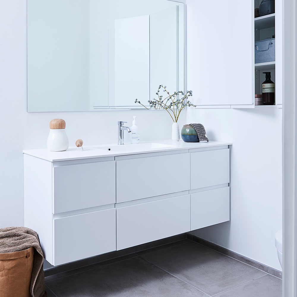 Parret har givet badeværelsets hvide udtryk et varmt og levende modspil af klinker i naturlige lyse nuancer. De rolige hvide flader gemmer på en smart detalje - en indvendig bakke til alle småtingene. Hold orden med flotte æsker eller den nye fleksible skuffeinddeler med tre små og en stor inddeler, som du kan placere efter behov.
