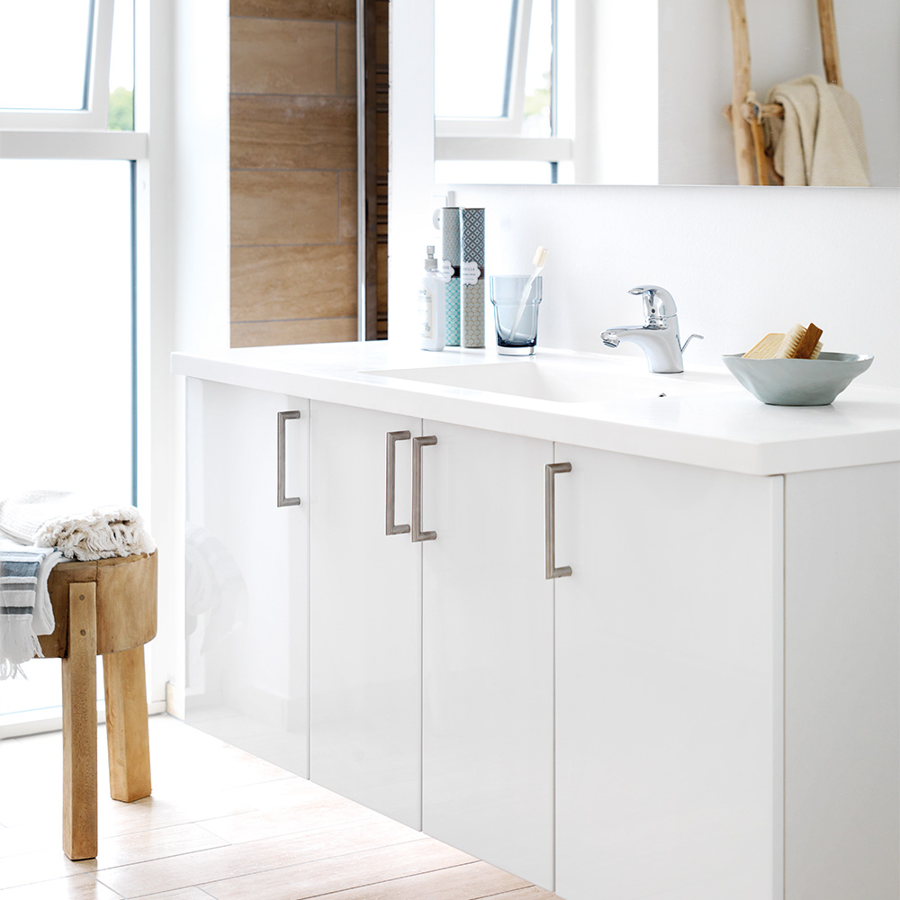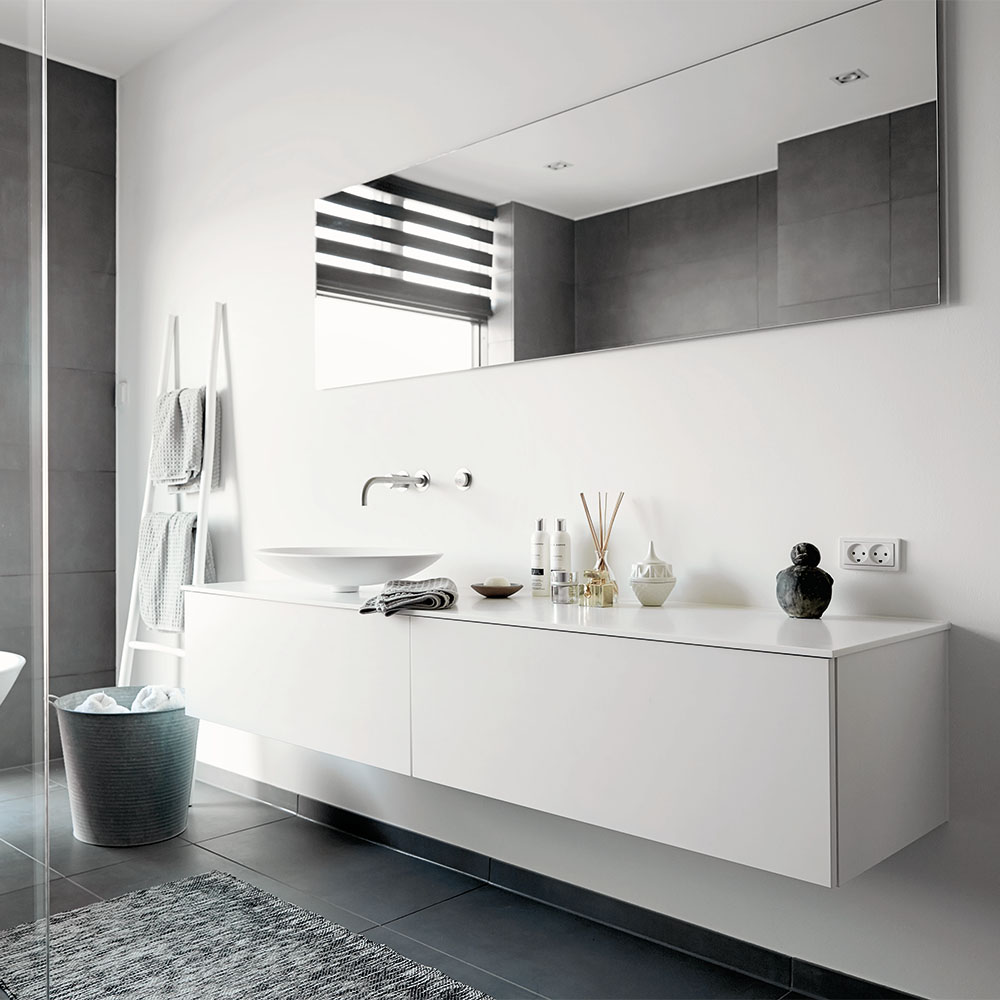 Du kan gennemføre det hvide badeværelse med helt hvide skuffer, skabe kontrast med grå skuffer eller ose af ægte håndværk med massive træskuffer. JKE har skuffer og indvendige bakker med fuldudtræk i hvid, grå og massive træskuffer, i flere dybder og højder lige fra 30 cm til 120 cm i bredden.