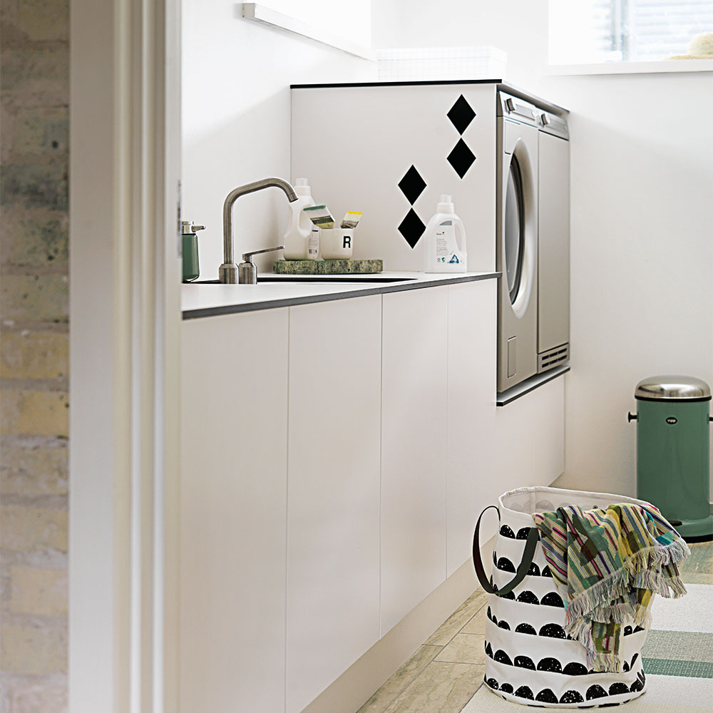 Tænk over valget af hvidevarer. Ofte tænker vi ikke meget over, hvordan vores vaskemaskine ser ud, men du kan strømline udtrykket i bryggerset, hvis du vælger en maskine i en særlig farve, eller ved at skjule maskinen med en skabslåge.