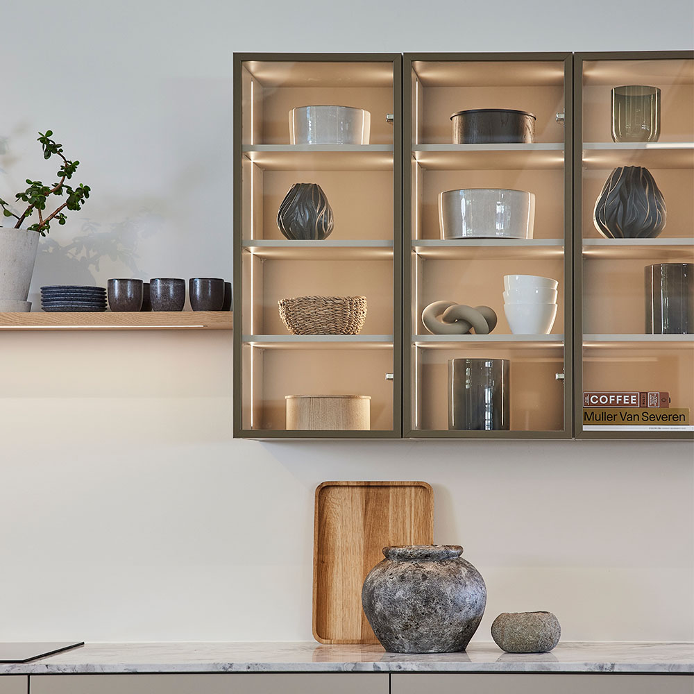 Vi har nytænkt vitrineskabet og kombineret et stramt, industrielt design med varme og hygge fra røgfarvet glas, træhylder og blødt lys. Det kan kombineres med alle modeller og give køkkenet liv og personlighed.