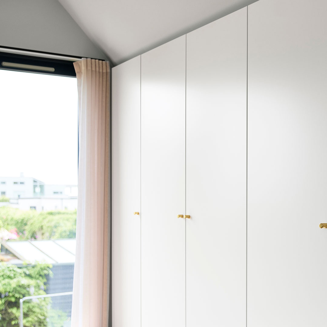 Uanset om du foretrækker garderobeskabe eller skydedøre, har JKE den perfekte opbevaringsløsning til dig, selv i snævre og skæve rum. Vores skræddersyede løsninger kan integreres og tilpasses skrå vægge. Besøg din lokale JKE-butik, og lad os skabe en løsning selv til de mest udfordrende vinkler.