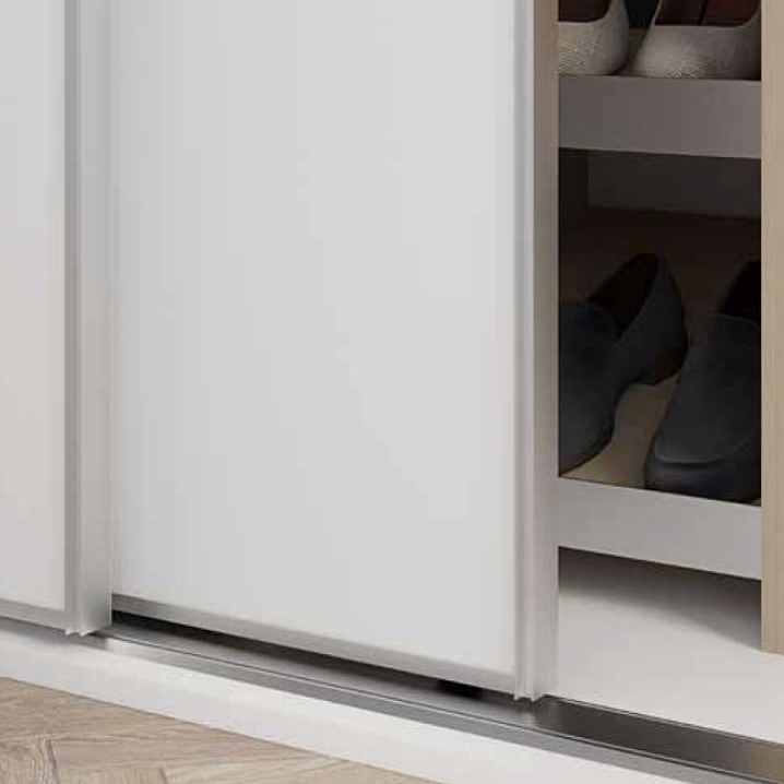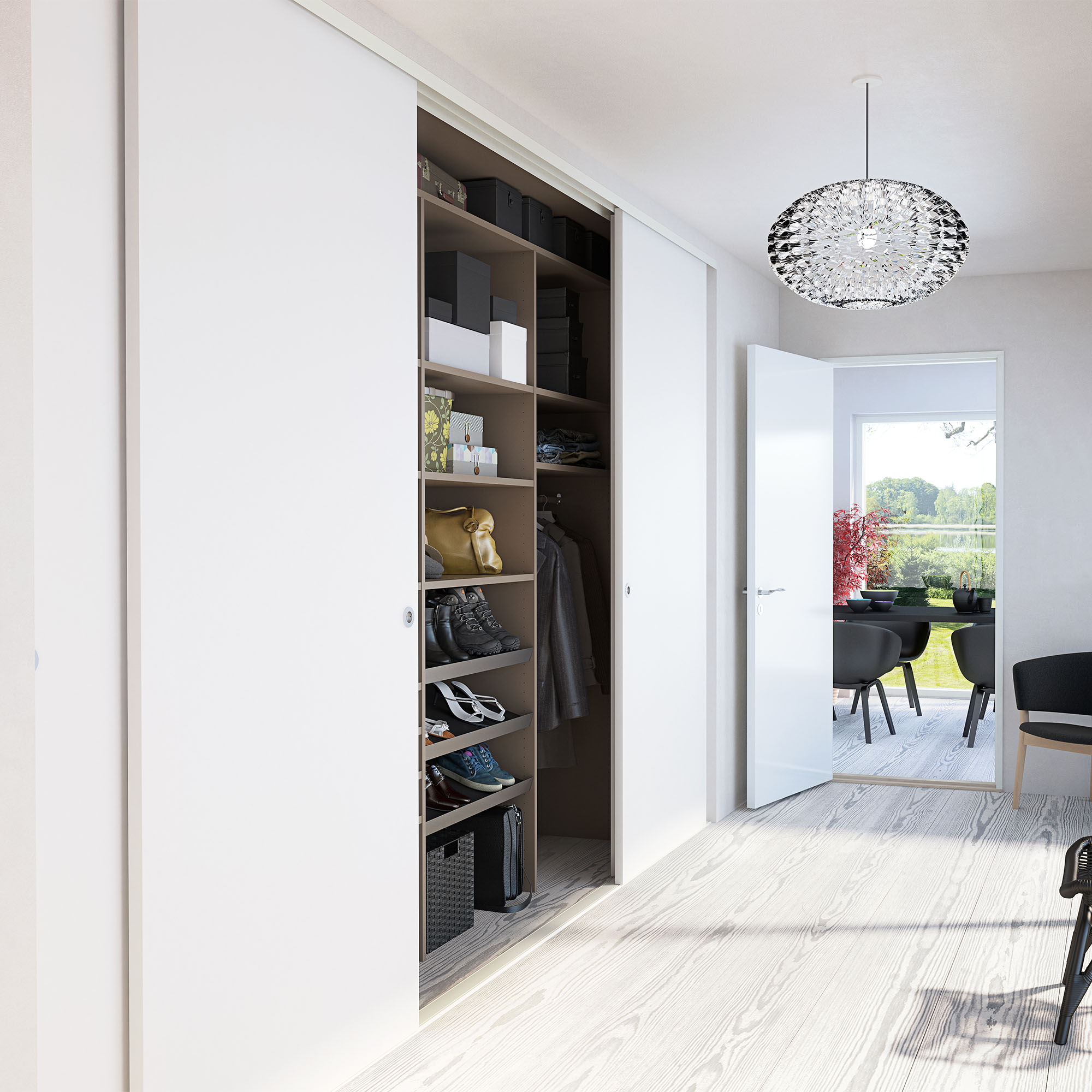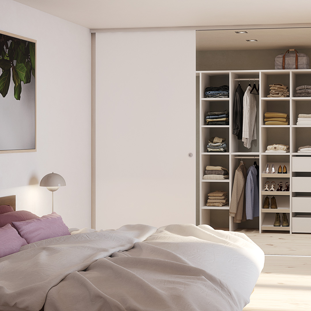 Det giver et roligt og rent udtryk, der falder naturligt ind i moderne indretning. Dørene glider lydløst til side og bidrager med en følelse af balance og enkelthed i rummet.