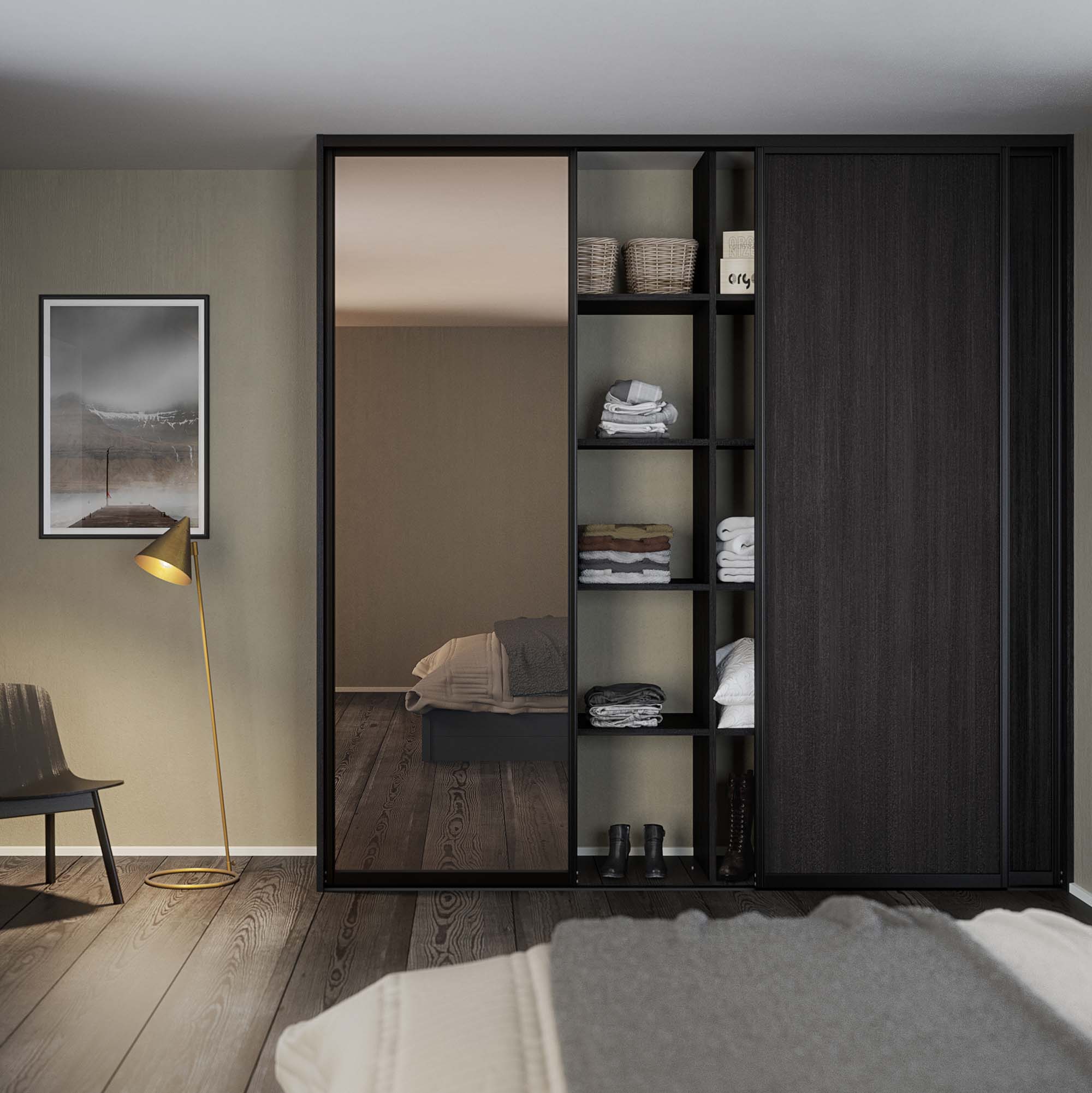Skal dit skydedørsskab indrettes med en spejlfyldning, kan du vælge mellem 3 flotte spejlfyldninger