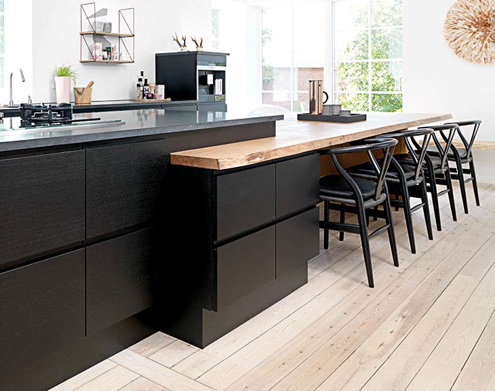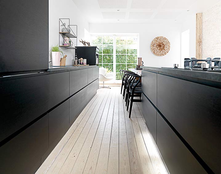 Det sorte køkken er nyklassikeren: rå og kontrastfyldt. Her får du samme stringente, 100% gennemførte stil som det hvide køkken – men med et mere eksklusivt udtryk.