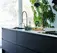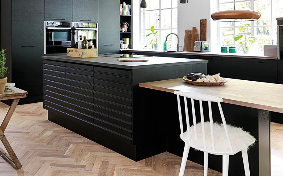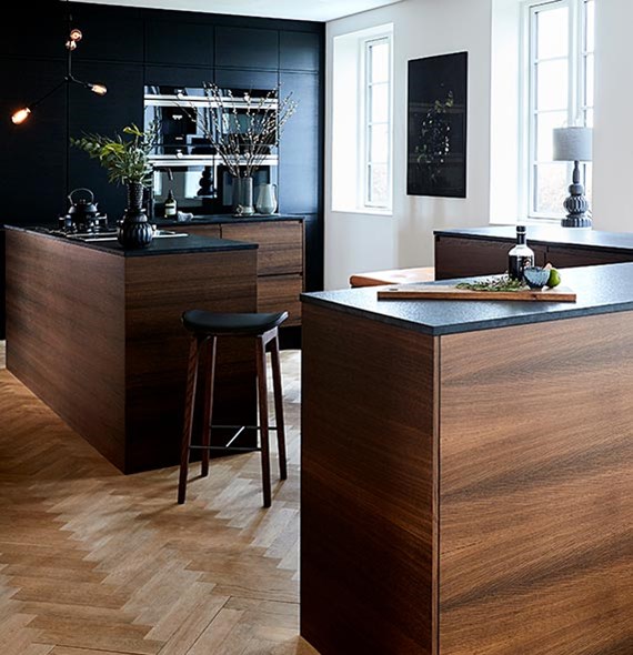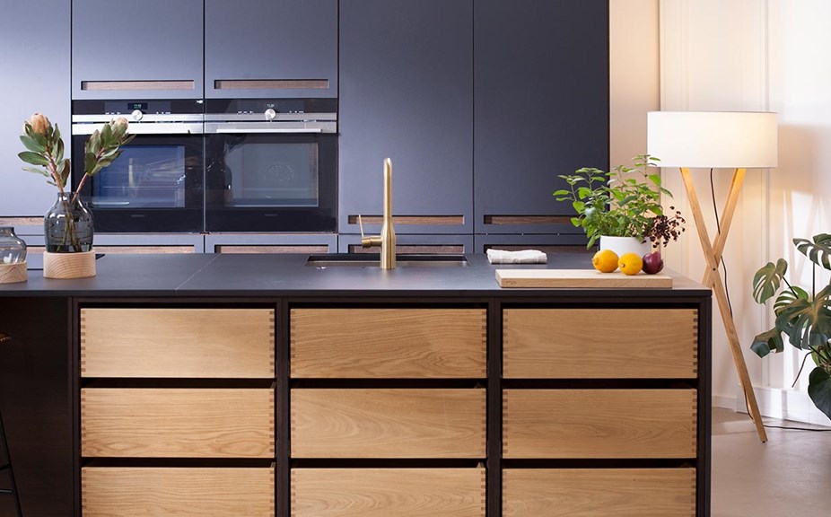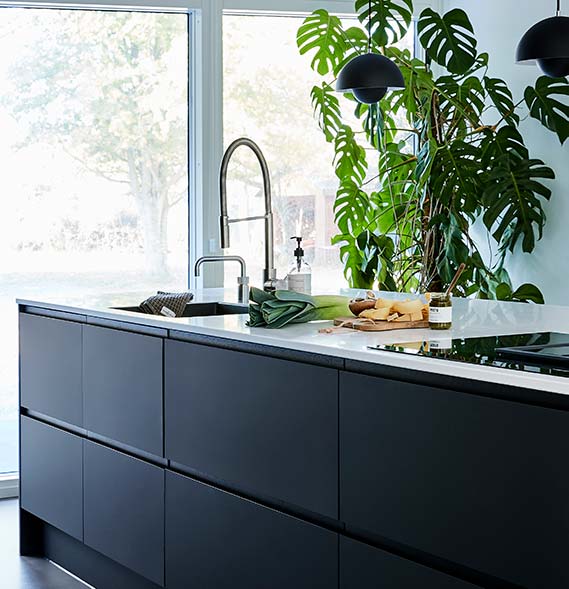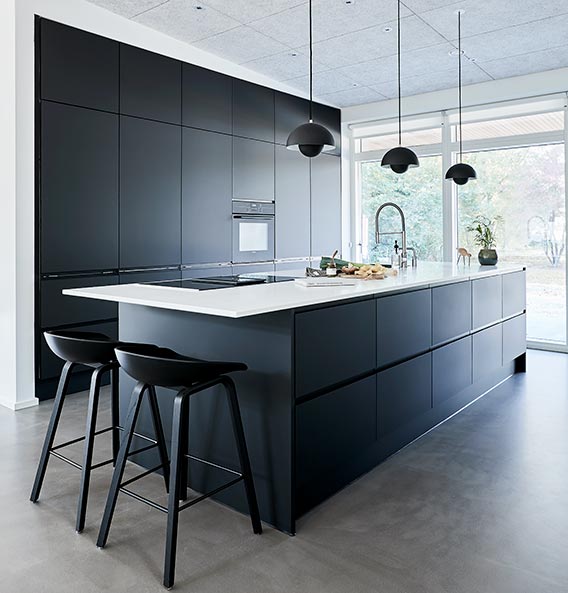 Køkkenet er bygget op omkring køkkenmodellen Nordic Inline fra JKE. Det er en tidsløs køkkenmodel der emmer af både kvalitet og stil. Den glatte låge med det grebsfrie design med det afdæmpede udtryk passer perfekt til et sort køkkendesign. Det er både eksklusivt og fremhæver detaljerne.