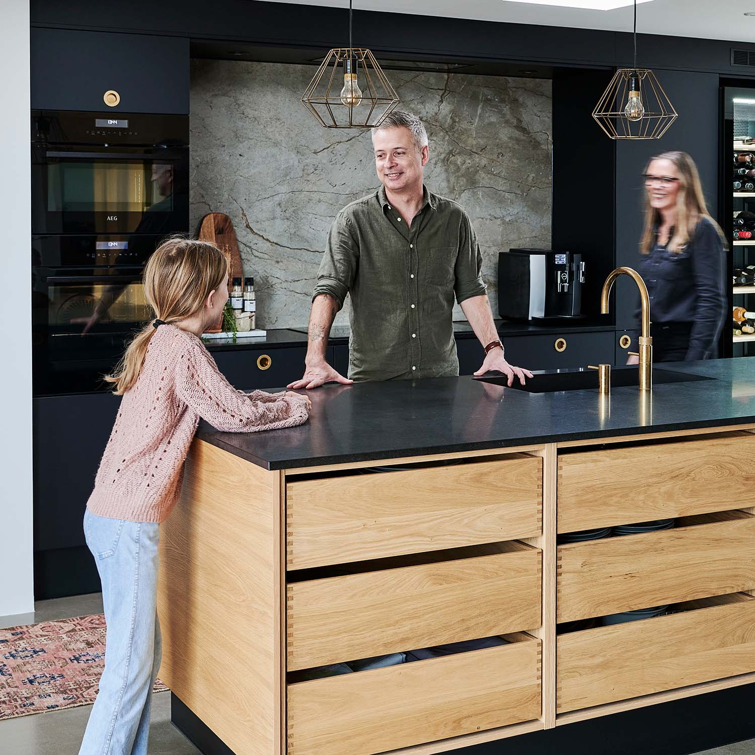 De har valgt egetræ kombineret med mørke, silkebløde overflader som gennemgående materialer. De fingertappede træsskuffer er både moderne og trækker en lige linje tilbage til det oprindelige materialevalg, og sender et klart signal om at familien holder af snedkerkvalitet og naturen.