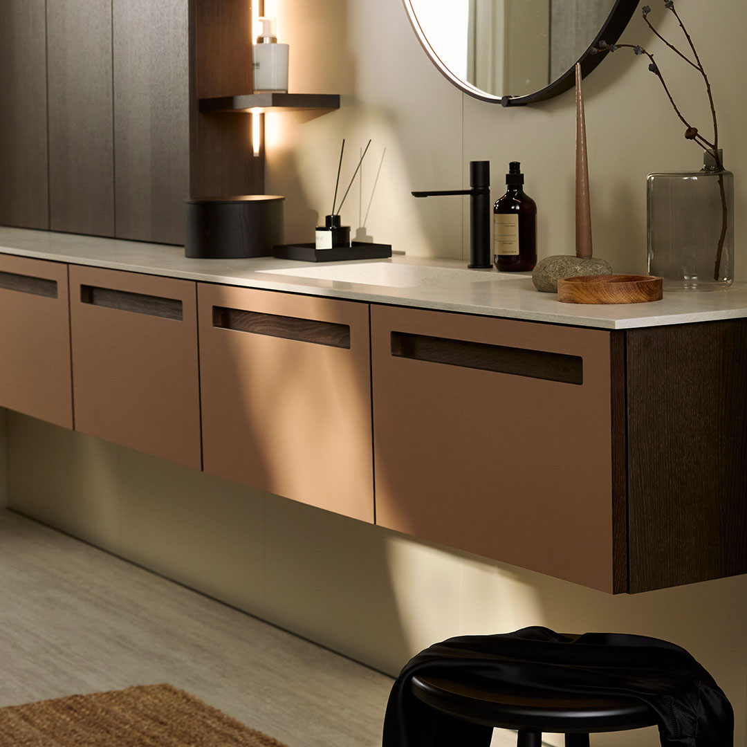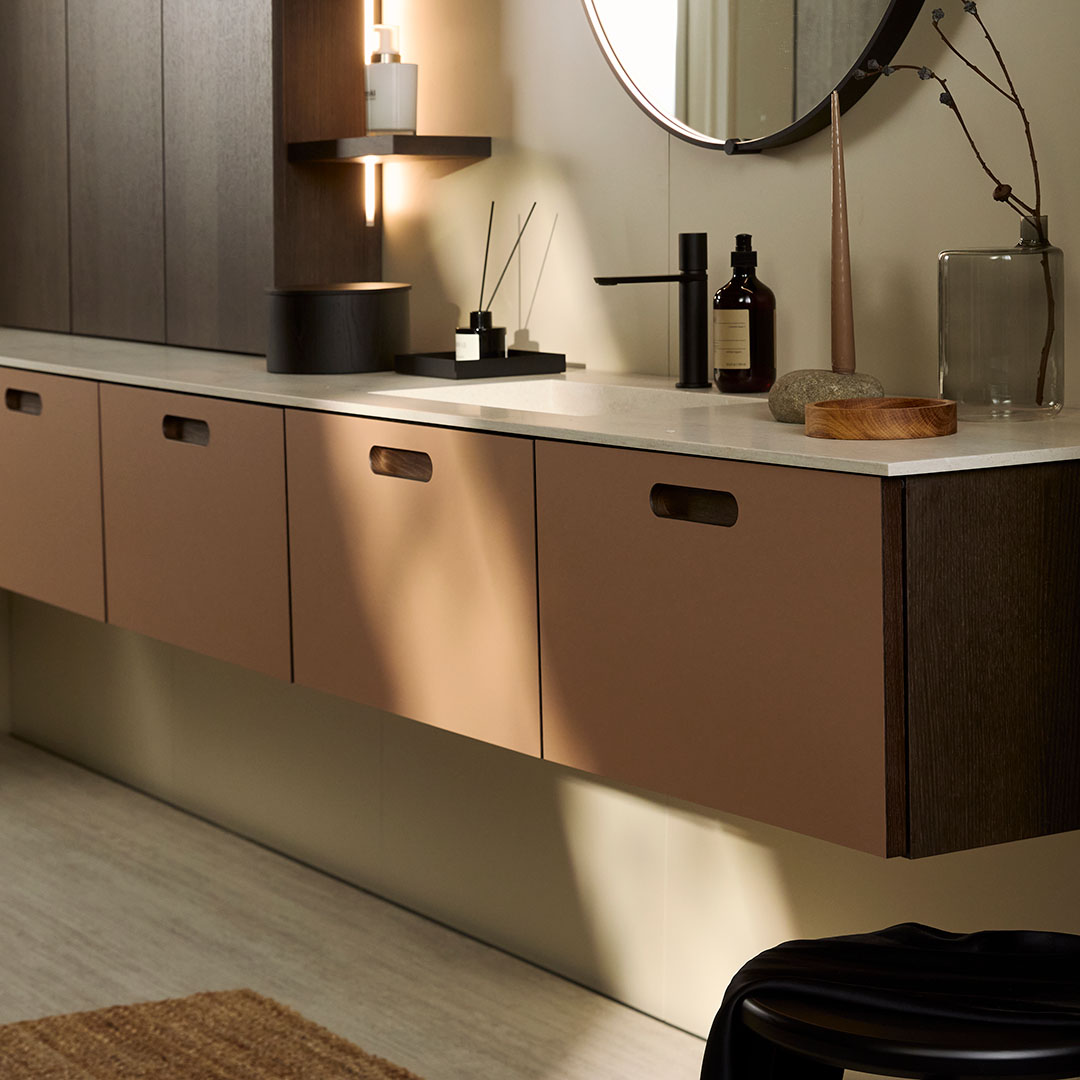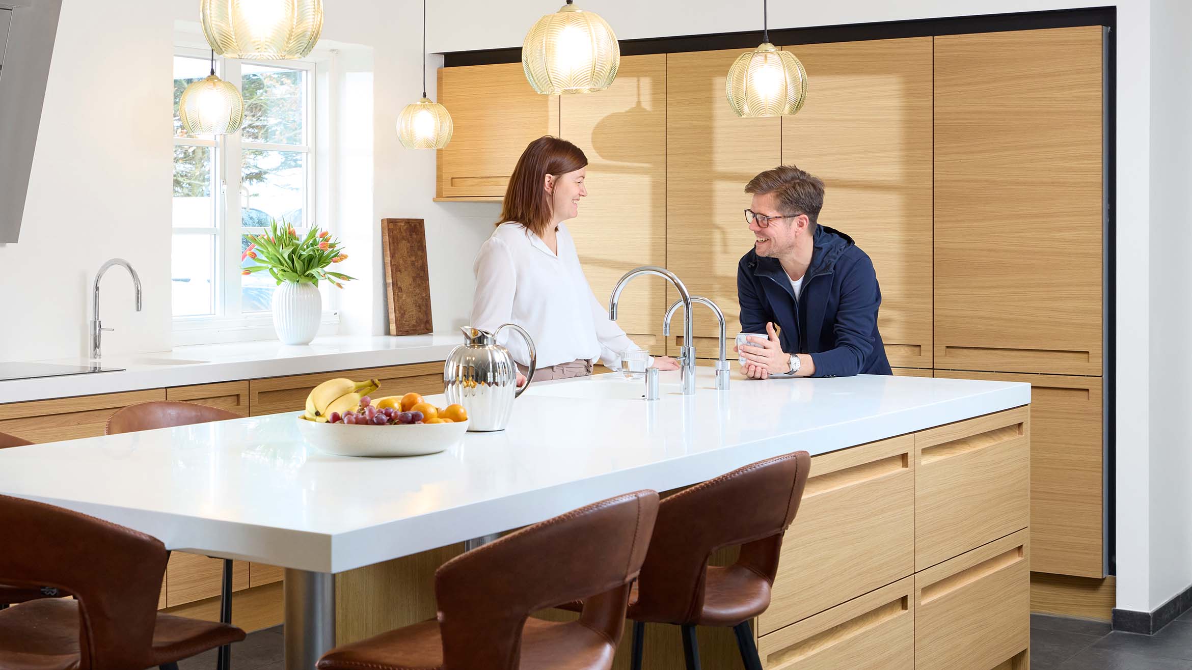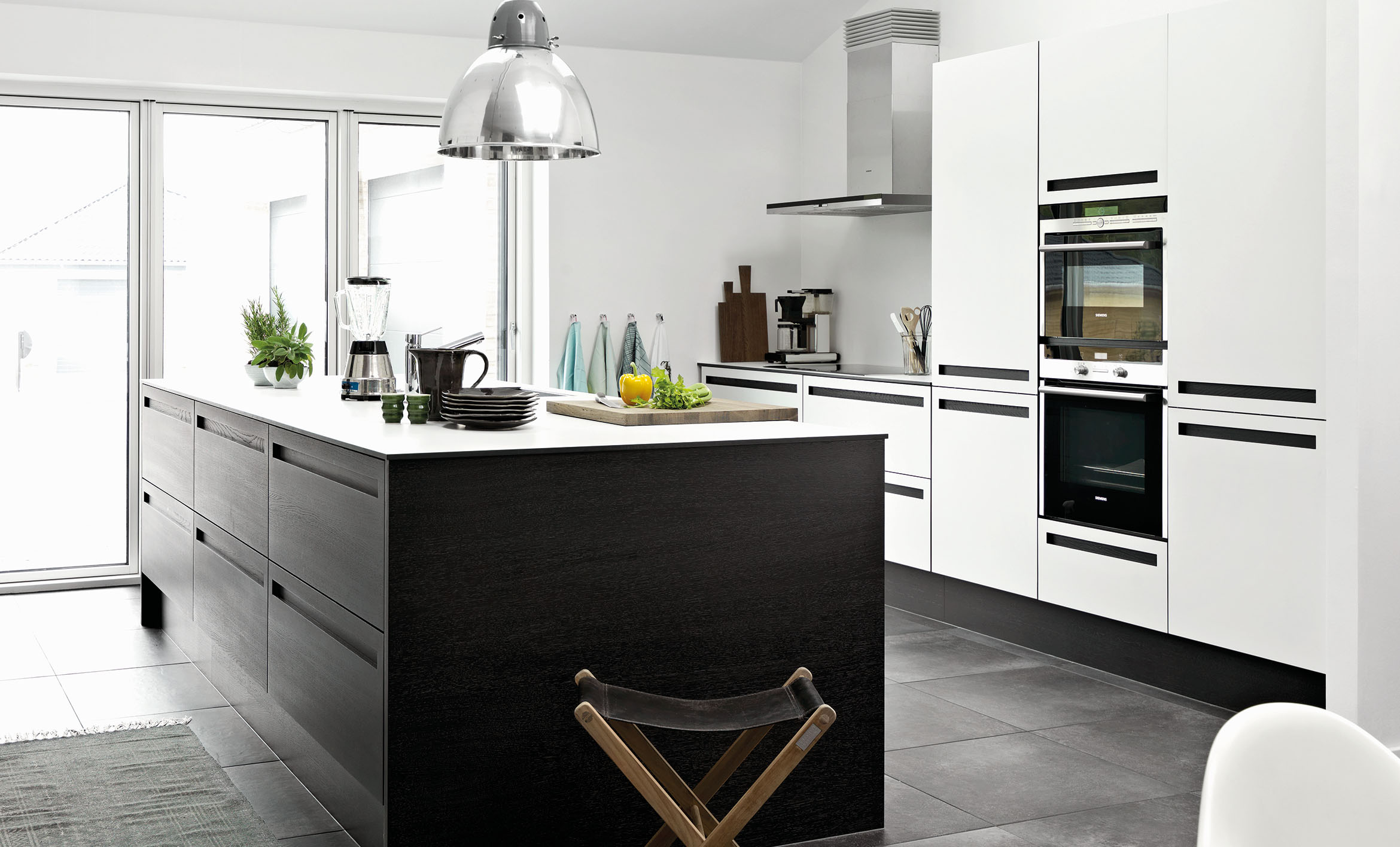 Nordic Modern ændrer sig markant alt efter, hvilken træsort eller farve du vælger til fronten sammen med det indfræste greb. Skab fx en lys nordisk stil med lyse låger og greb i eg, skab større kontrast med røget eg, eller vælg en af de nye linoleumsfarver.