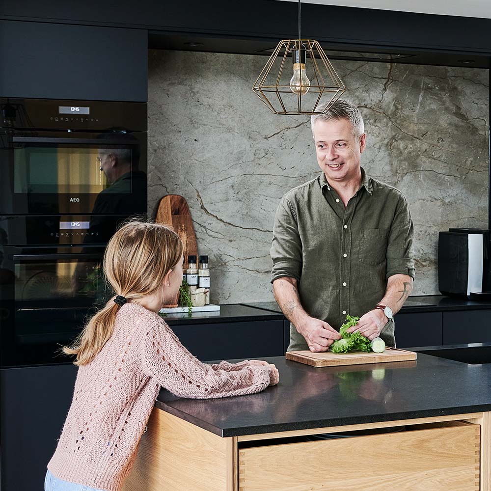 Hos Lene og Andrew er egetræ kombineret med mørke, silkebløde overflader på skuffer gennemgående materialer. Det skaber en varm og hyggelig atmosfære, hvor familien nyder at samles. Samtidig holder Andrew meget af at lave god mad, hvorfor Nordic Silk er et perfekt valg til familiens køkken, da det kan tåle at blive beskidt og samtidig er nemt at gøre rent.