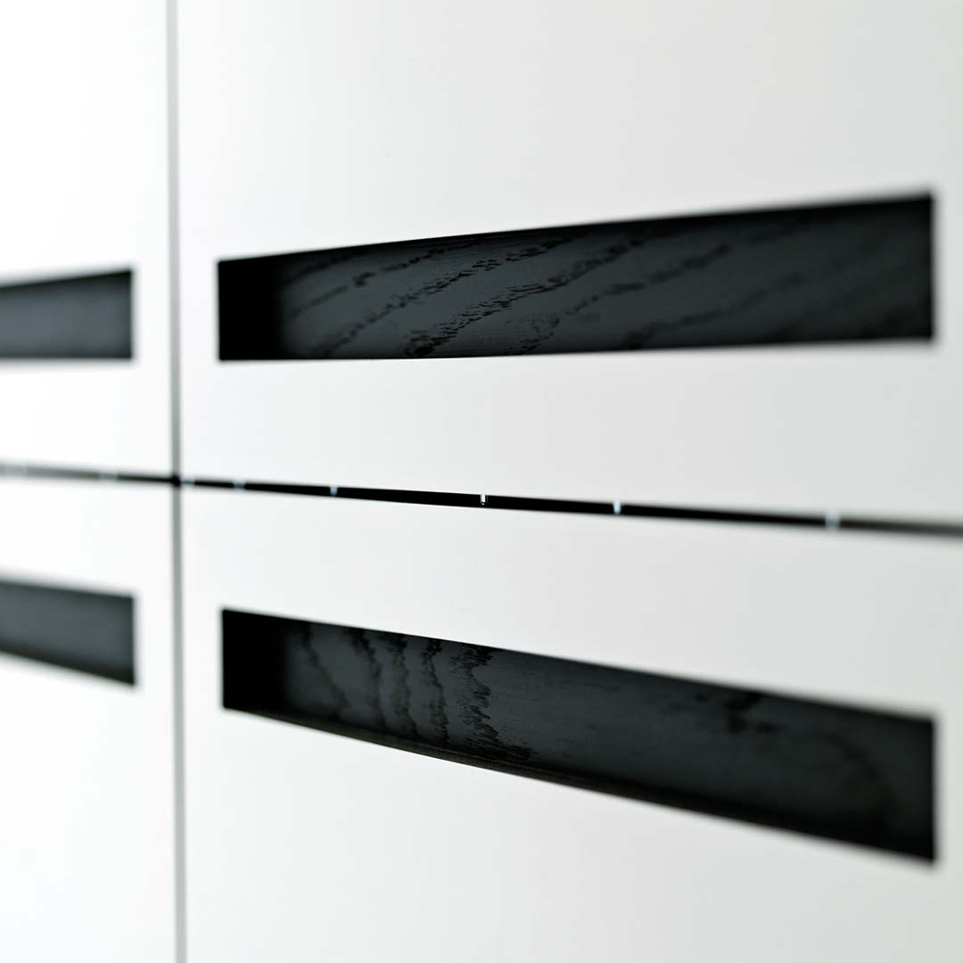 Laminat kan fås til flere modeller, fra den glatte låge Nordic One, den grebsløse Nordic Inline eller de mere unikke modeller Nordic Modern med indfræset greb og Nordic Multifront med vandrette lameller. Nordic Basic i hvid og grå fås også med laminat.