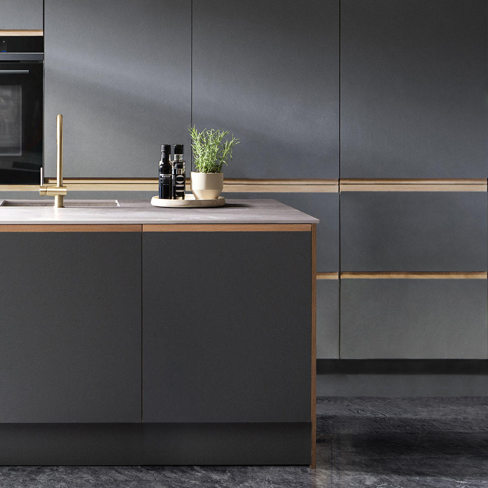 Halvor Bakkes egen favorit er et køkken med antracit linoleum kombineret med træ af røget eg. Lågerne er JKE model Nordic One med Edge greb i antracit lak. Bordpladen er sort keramik med sort vask. Se Halvor Bakke fortælle om sit favoritkøkken og de forskellige muligheder.