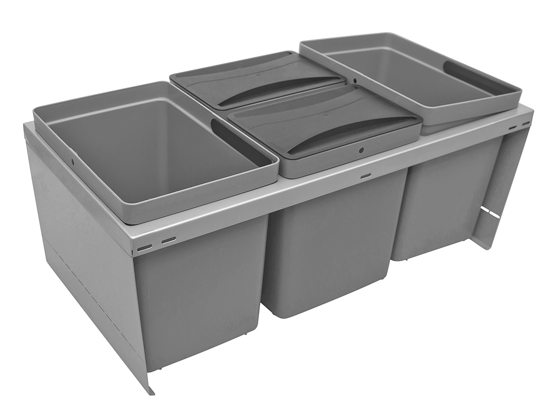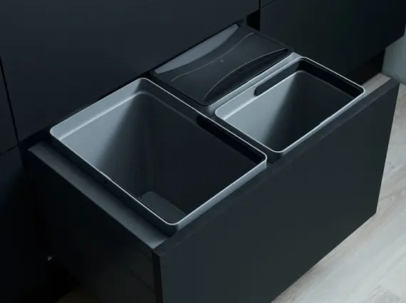 Funktionelt og praktisk affaldssystem med grålakeret ramme. Fås i to varianter til montering i bund af henholdsvis Hvid og Craft skuffe og en variant til montering i Zentith skuffe.