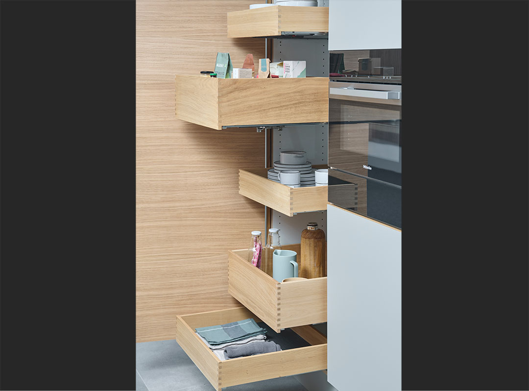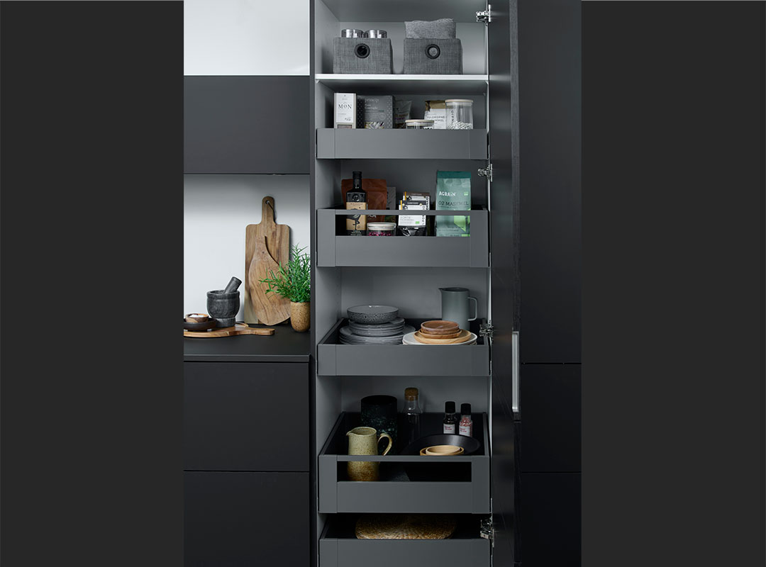 Et højskab i køkkenet giver masser af dejlig opbevaringsplads. Skabet med udtræksbakker giver mulighed for at se, hvad der står inderst. Lækkert og overskueligt både til service og kolonialvarer.