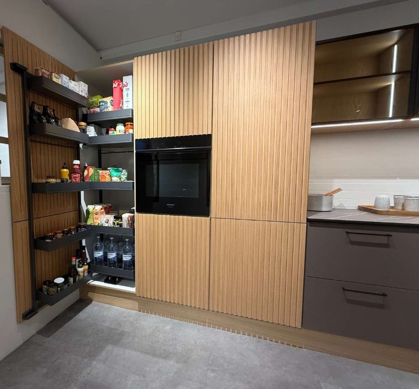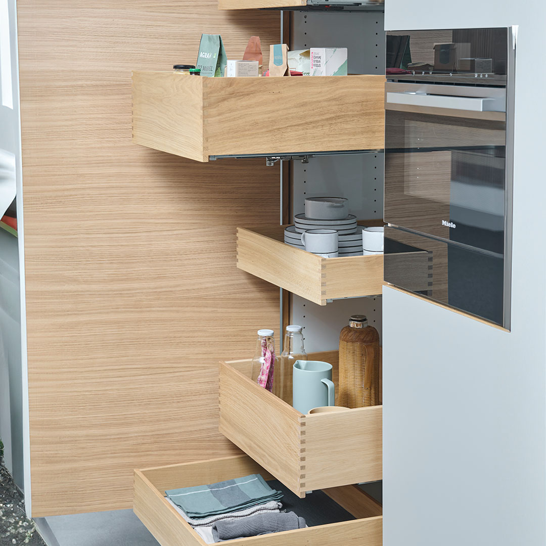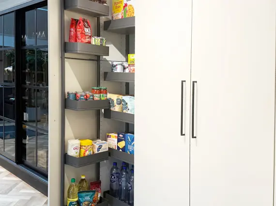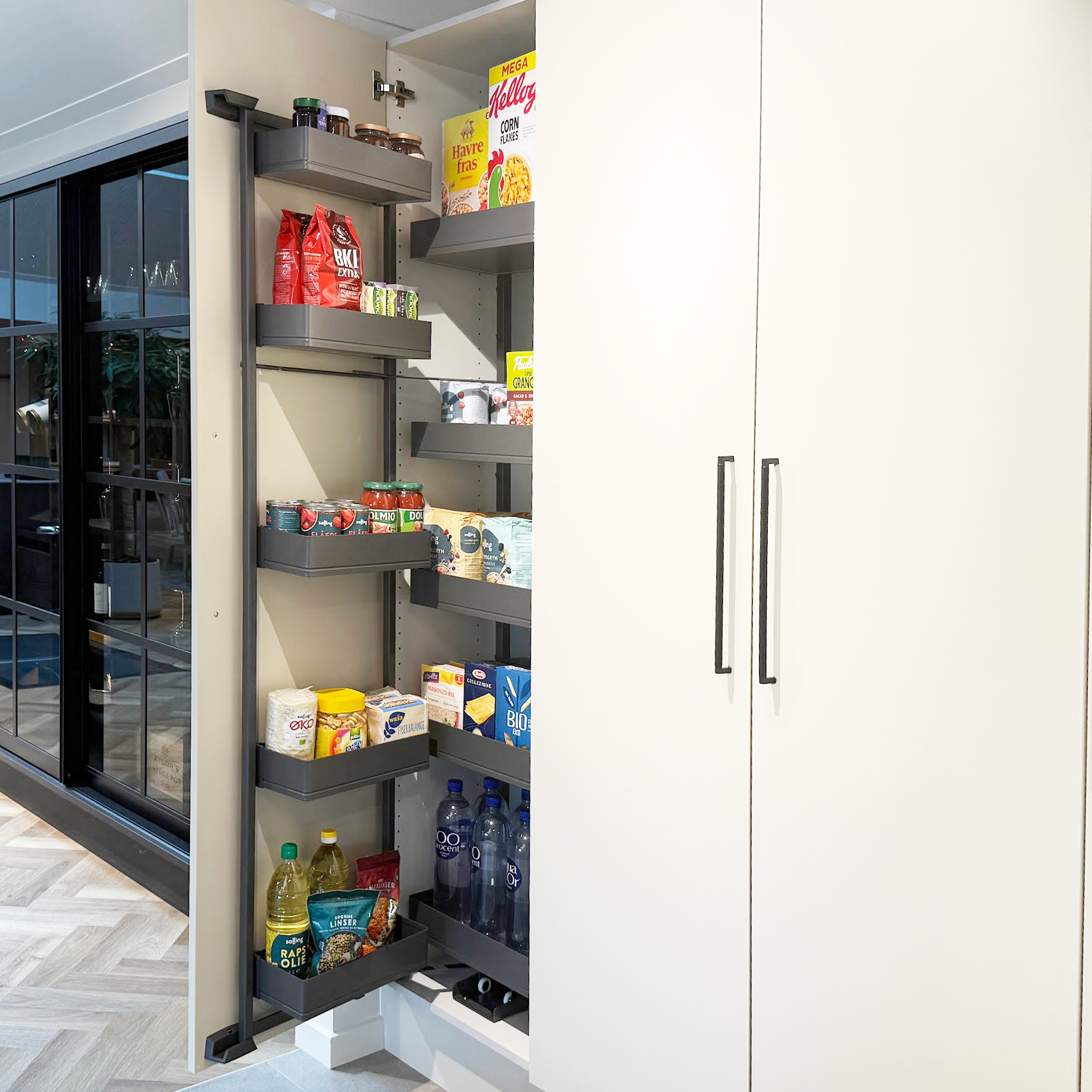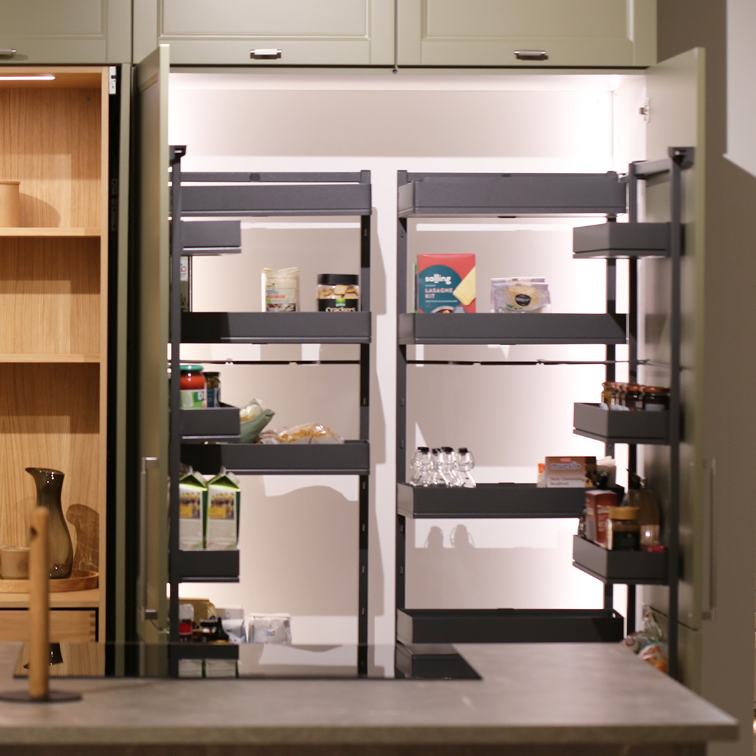 Kolonialskabet giver masser af dejlig opbevaringsplads lige i øjenhøjde. Tandem udtrækket giver opbevaring i to lag, og dermed bedre overblik over eksempelvis kolonialvarer. Skabet monteres med et front udtræk, der følger med lågen ud, når der åbnes. Den ene del af opbevaringspladsen er på skabslågen og den anden del følger med ud, når du åbner skabet.