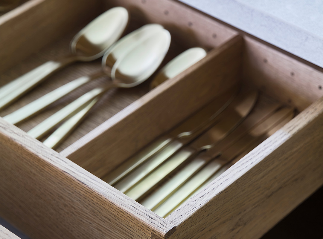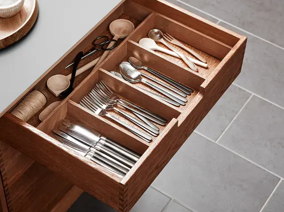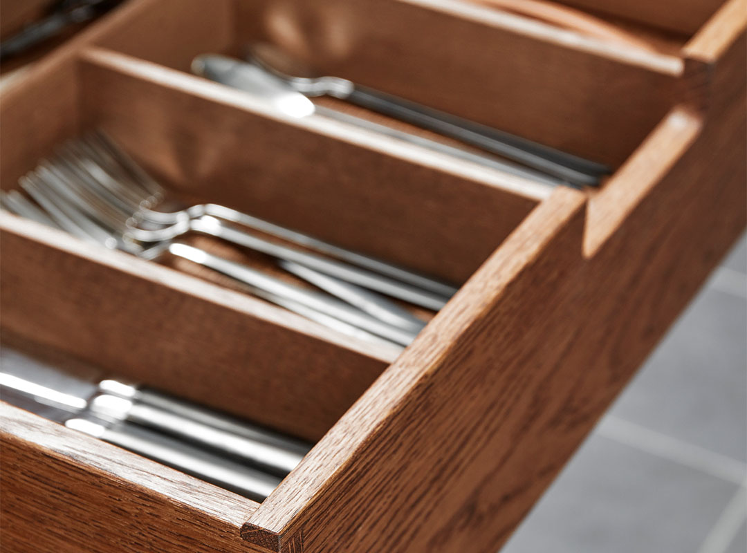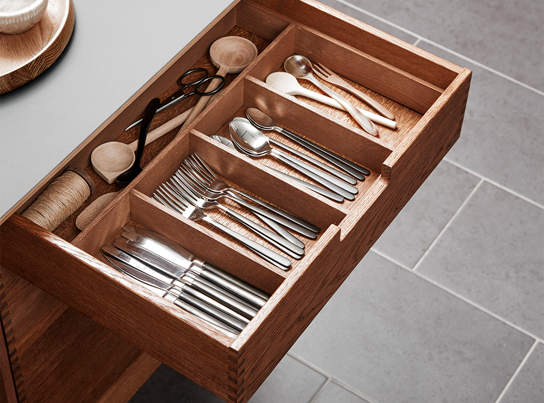 Indret skufferne med indsatse i træ. Indsatsene er i egetræ med en lækker håndværksmæssig finish. De er med til at fuldende designet af dit køkken, hel ind i skufferne. Ud over at holde orden i dine skuffer, er træ et naturligt materiale og derfor også en miljøvenlig løsning til dit køkken.