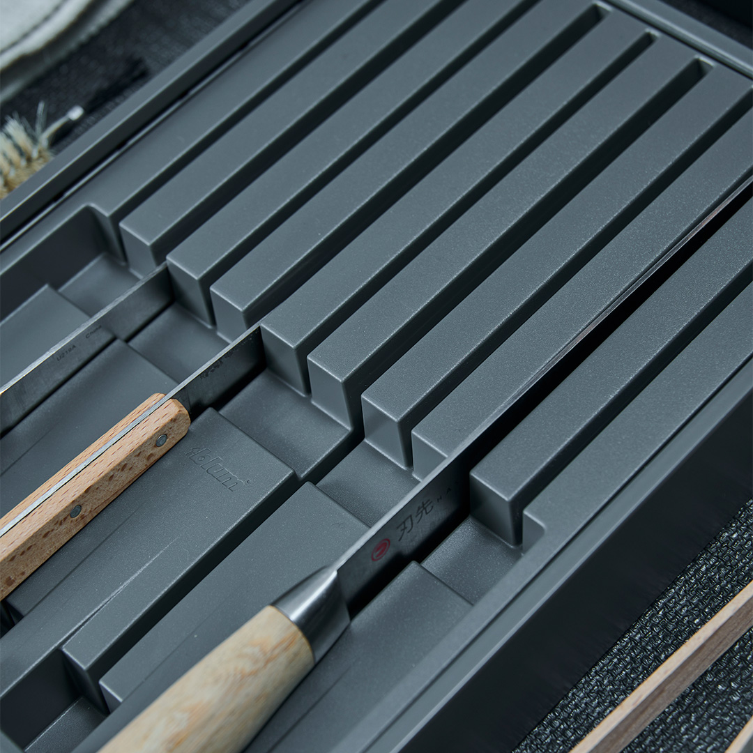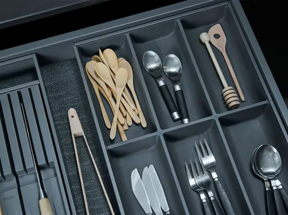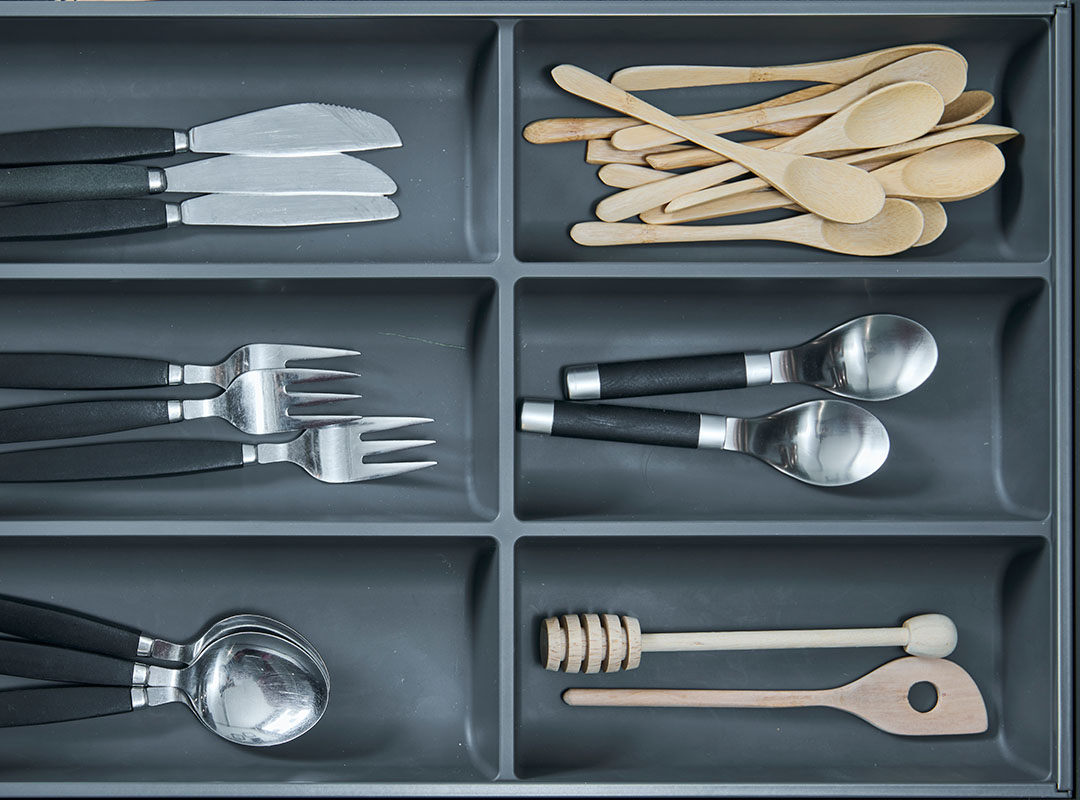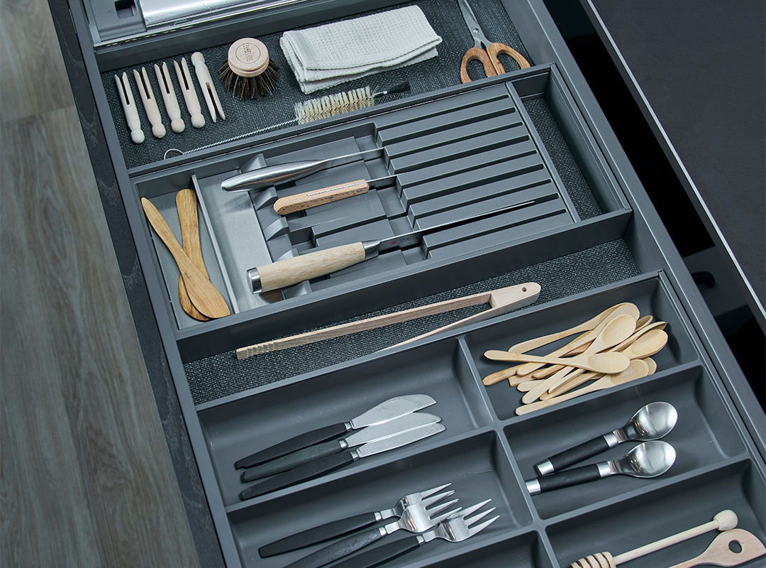 Serien omfatter virkelig praktiske inddeler til bestik, grydeskeer, knive og andre køkkenredskaber. Indsatse til folie og film. Der er smarte rum-delere, udformet som rammer, til større skuffer, evt til kopper og glas. Derudover tallerkenholder, der kan bruges til at bære tallerkenstakken ind på spisebordet eller fra opvaskemaskinen og tilbage på plads i skuffen.