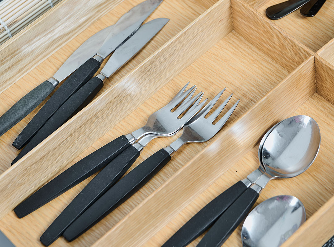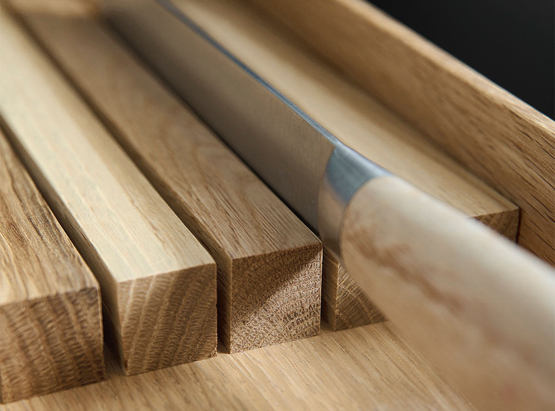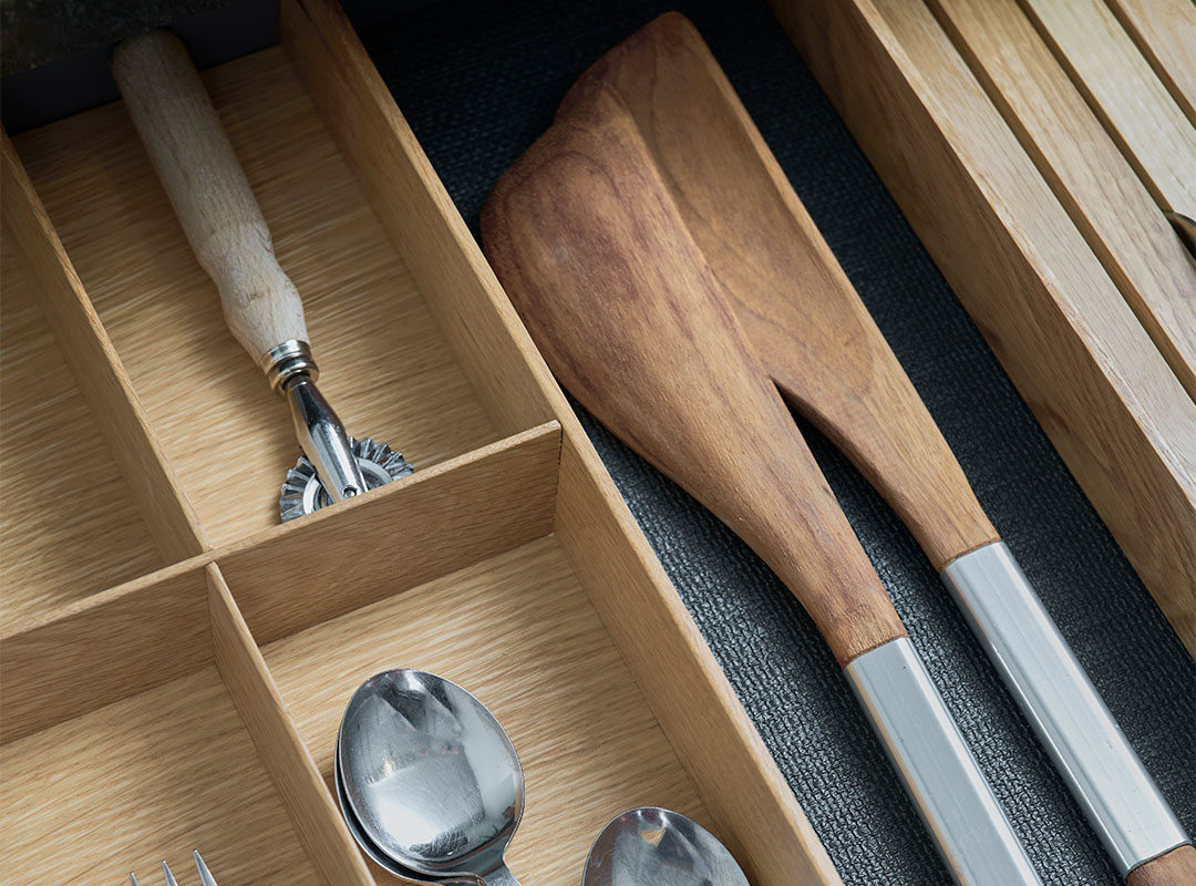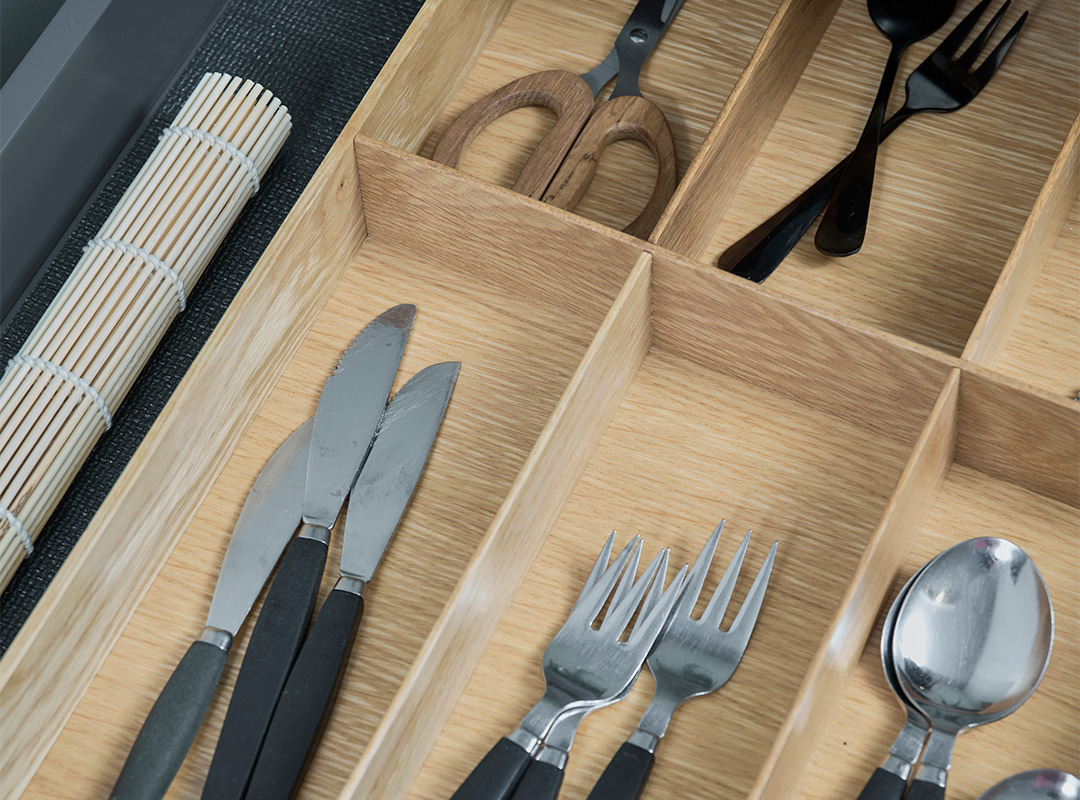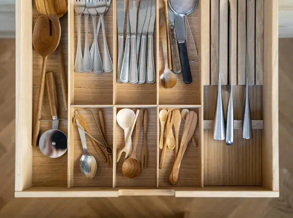 Indret skufferne med indsatse i træ. Indsatsene er i egetræ med en lækker håndværksmæssig finish. De er med til at fuldende designet af dit køkken, hel ind i skufferne. Ud over at holde orden i dine skuffer, er træ et naturligt materiale og derfor også en miljøvenlig løsning til dit køkken.