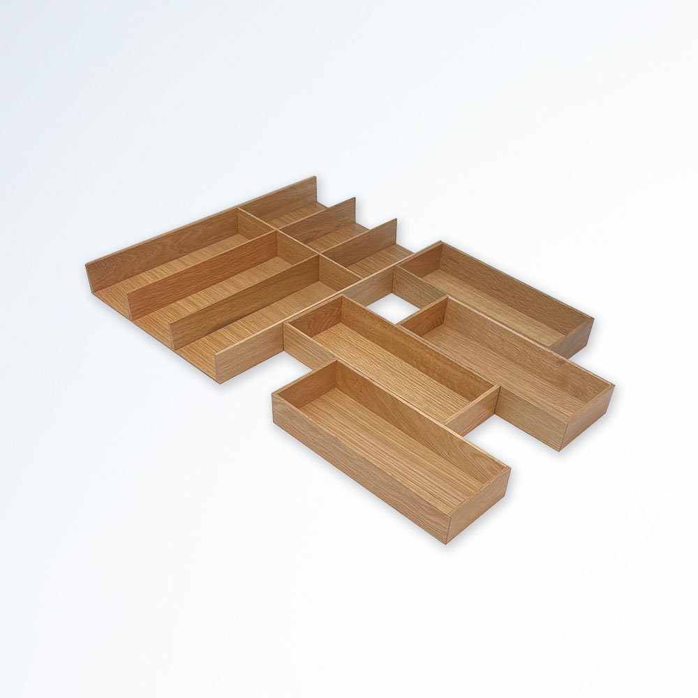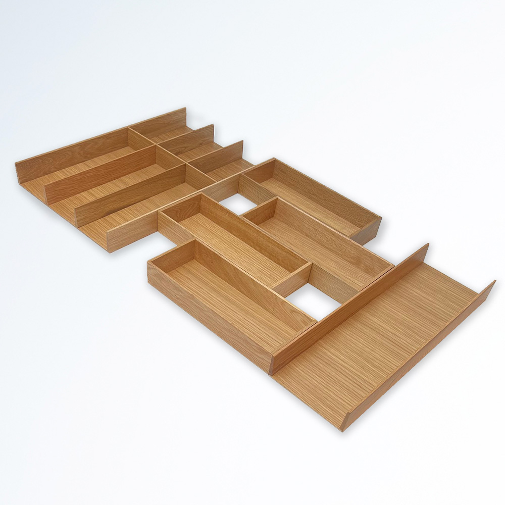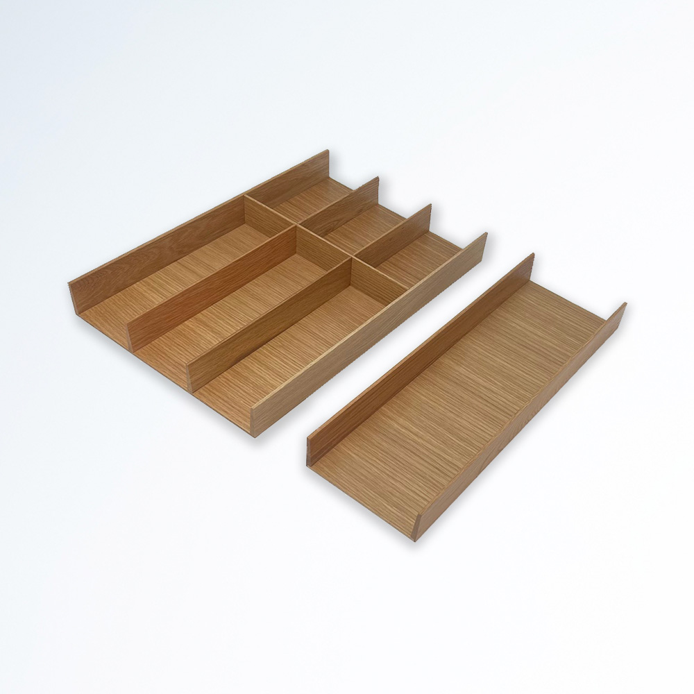 Bestikindsatsene i egetræ passer perfekt til både træskuffer og de grå Zenit stålskuffer.