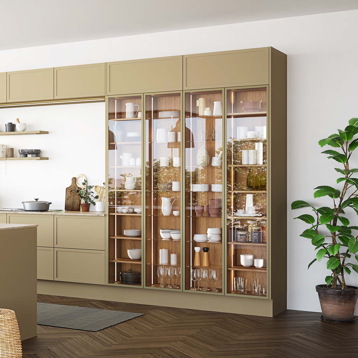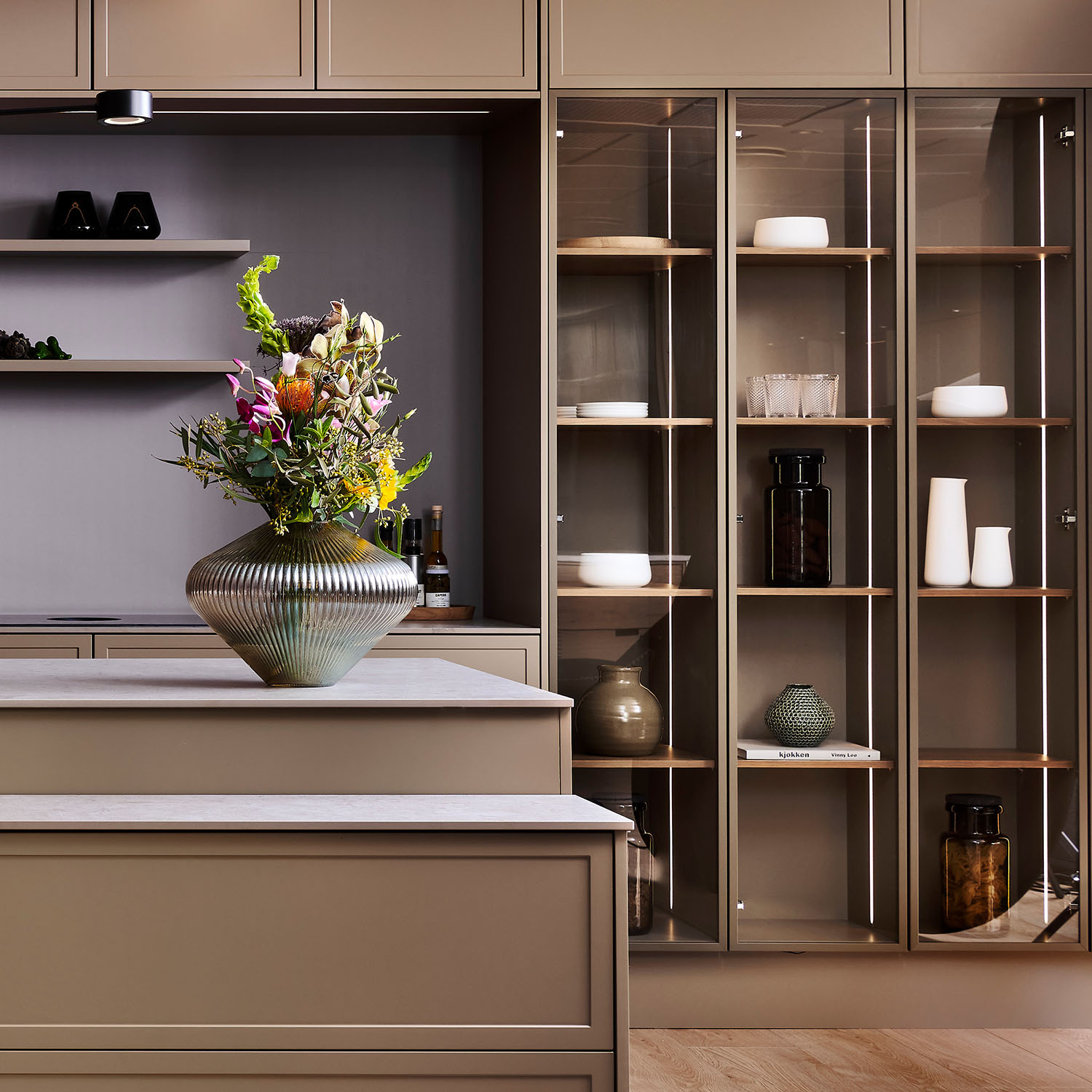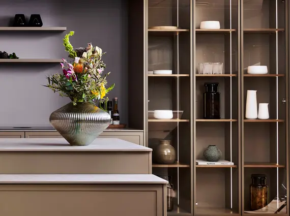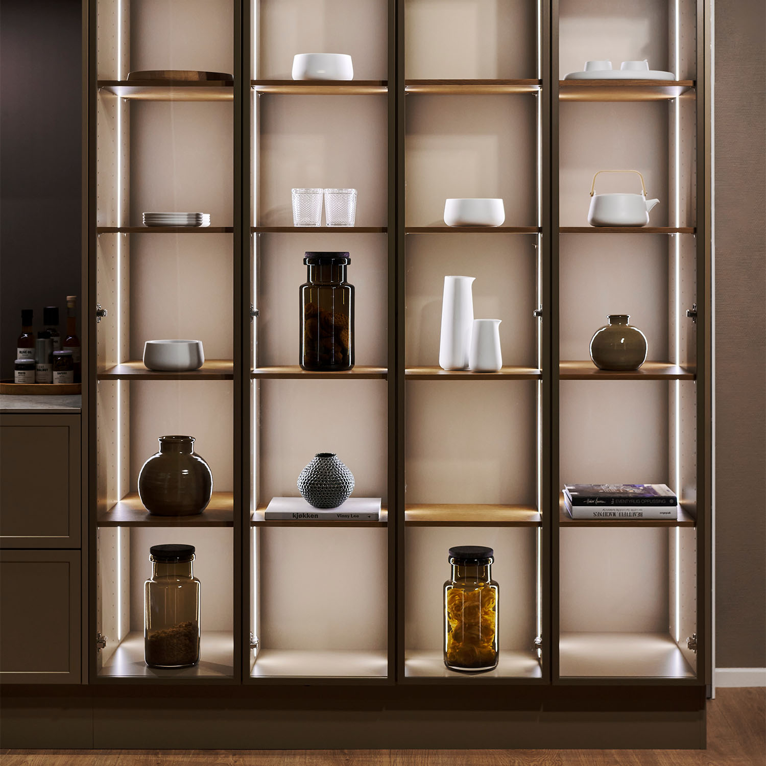 Vores unikke vitrineskabe fås nu også som højskabe. Vores vitrineskabe forener det stramme, industrielle design med den hyggelige atmosfære ved at fremhæve dine mest kære ejendele. Vi har erstattet de traditionelle spots med blødt lys, der følger skabets kanter og fremhæver vitrinens indhold smukt.