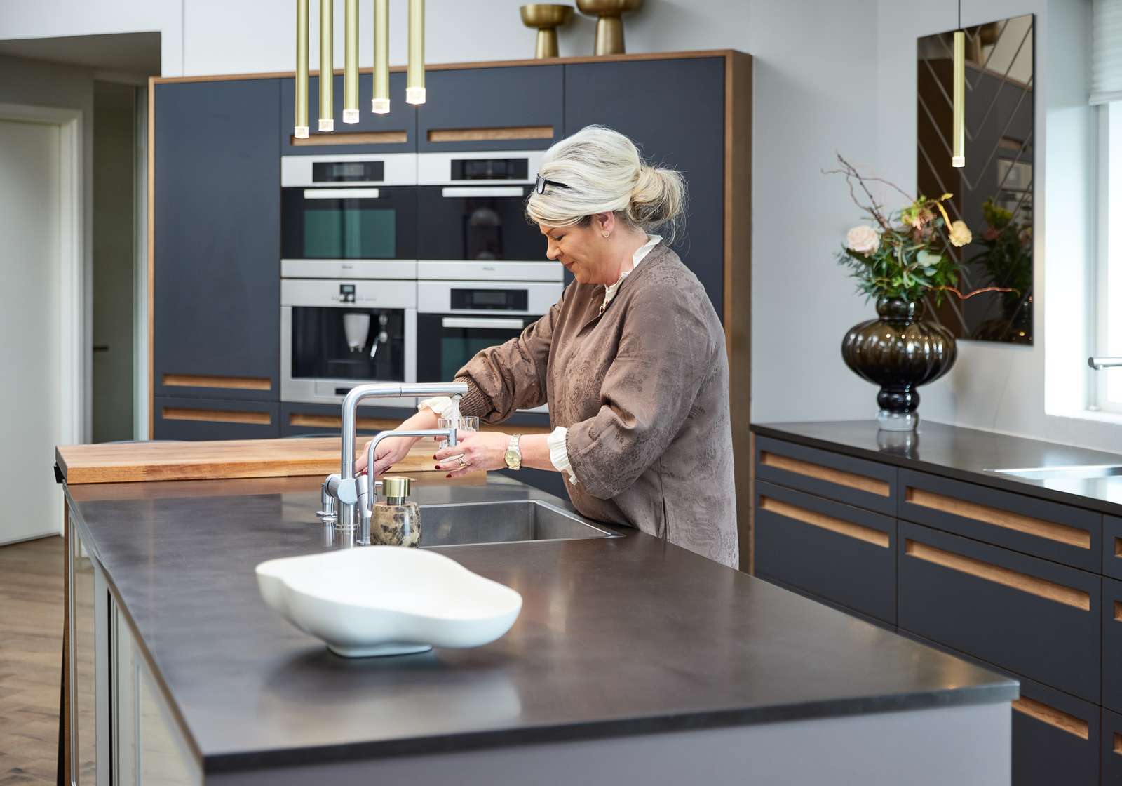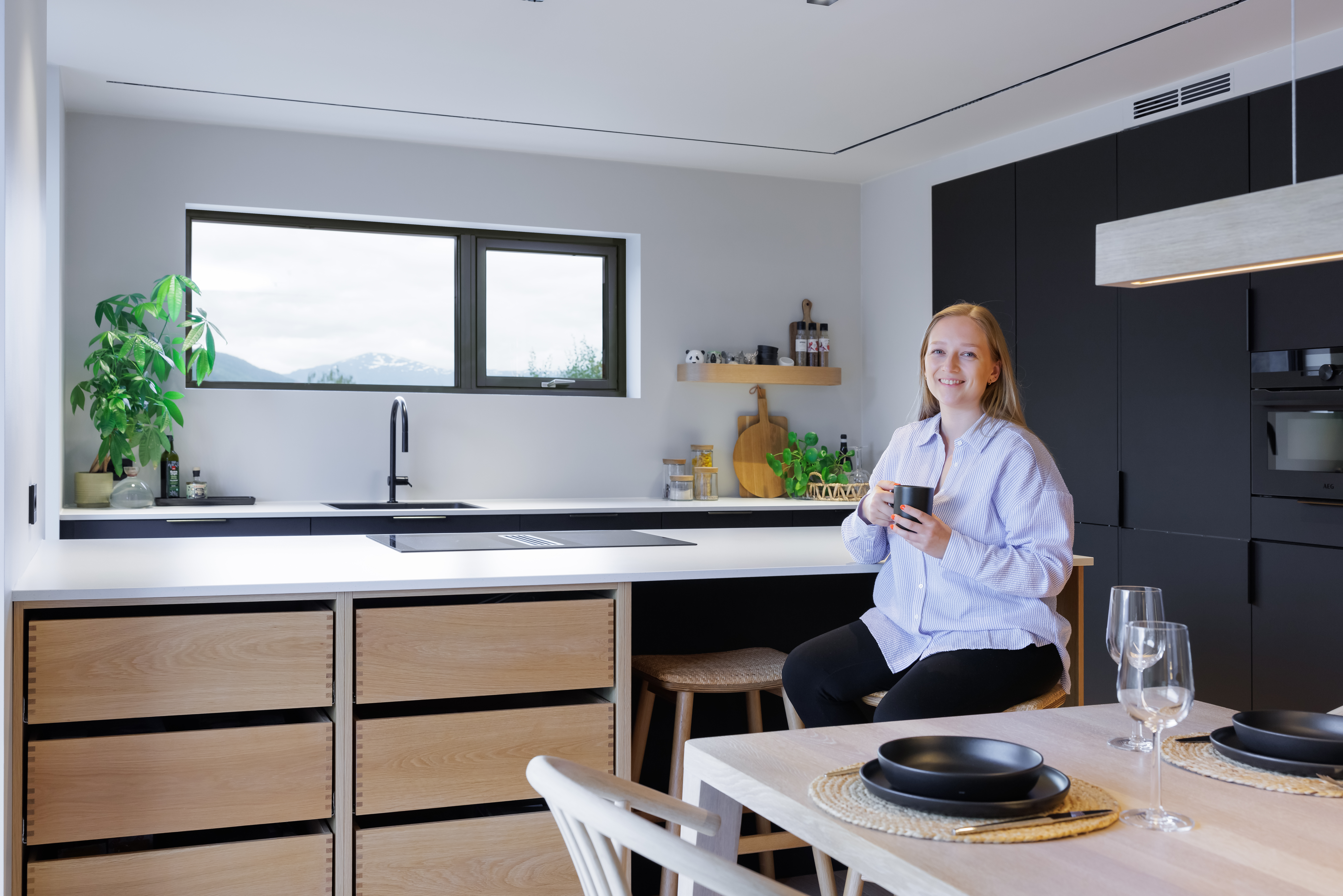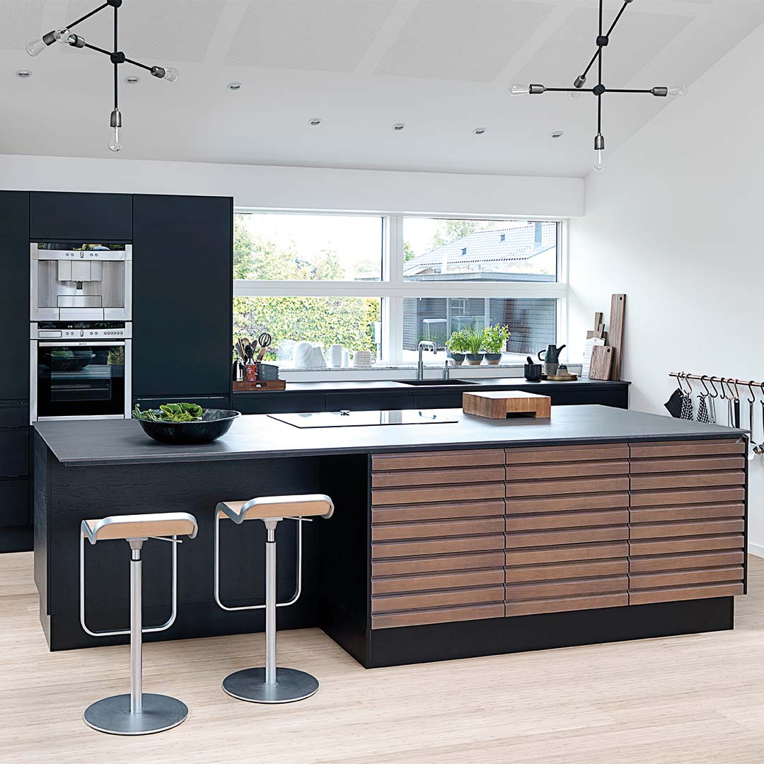 I dette smukke køkken kommer snedkerkvaliteten virkelig til sin ret med kombinationen af Nordic Modern og Nordic Craft. Det sorte skaber en moderne og stilren æstetik, mens de mere robuste egetræselementer tilføjer en følelse af godt håndværk og tidløshed.