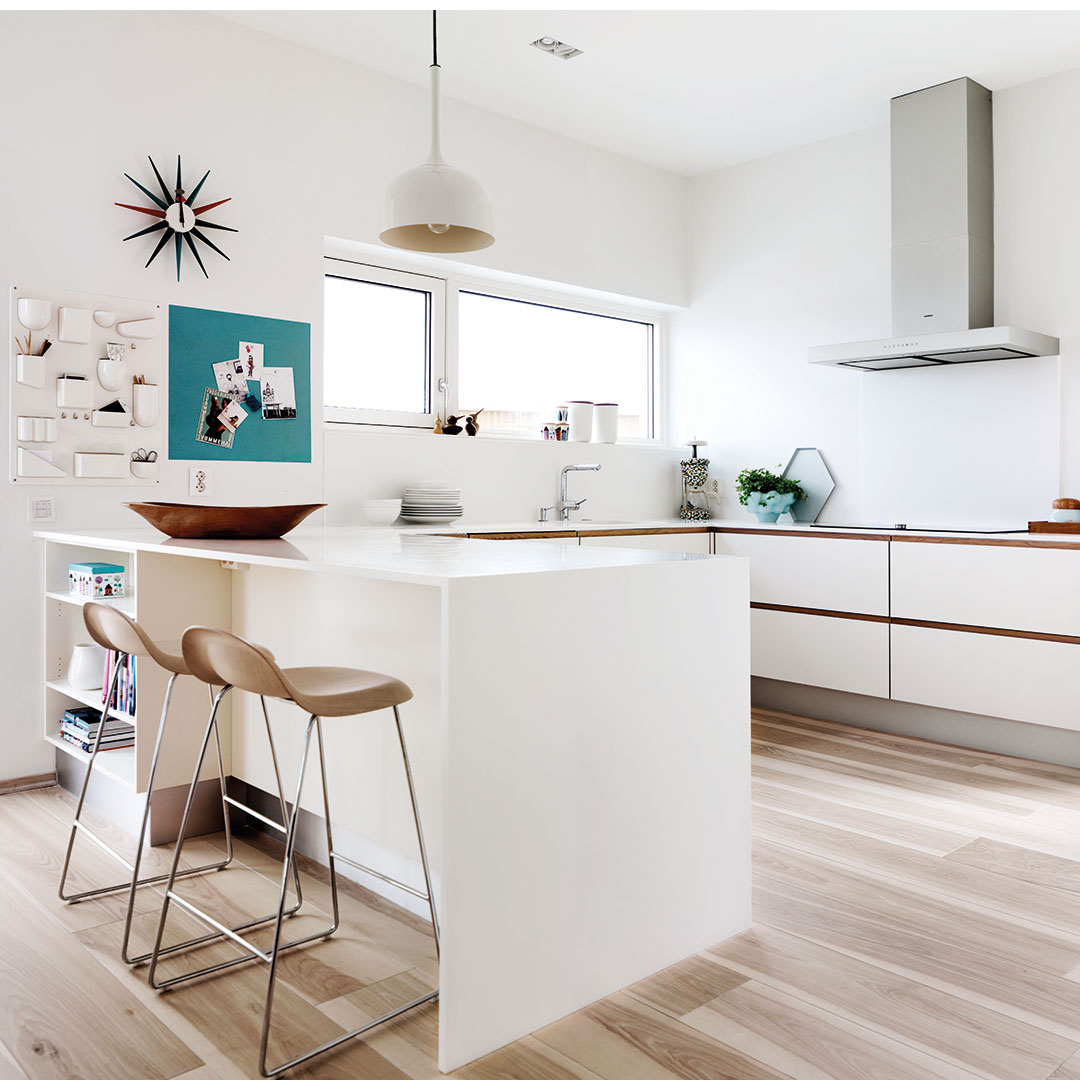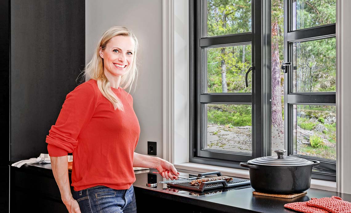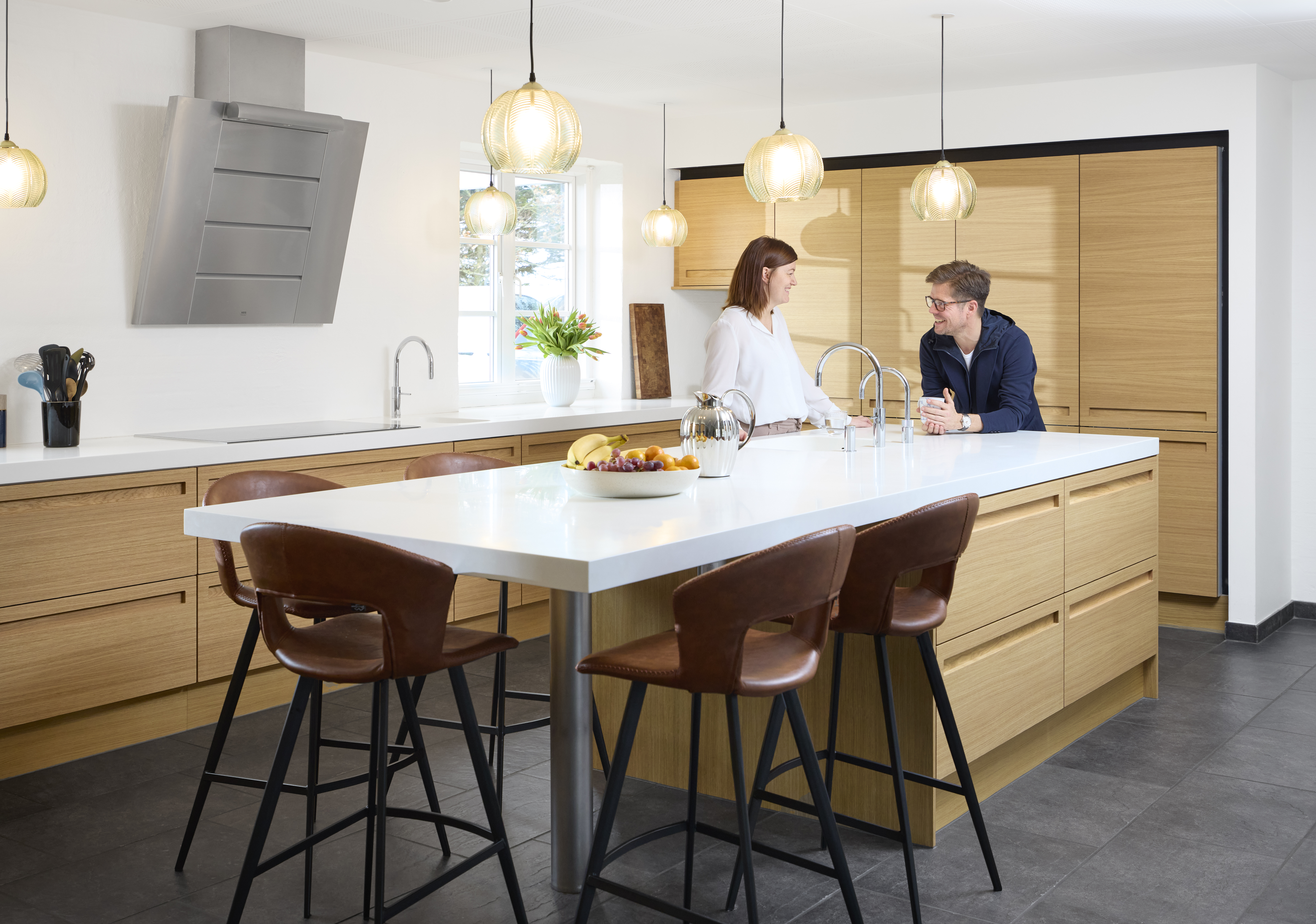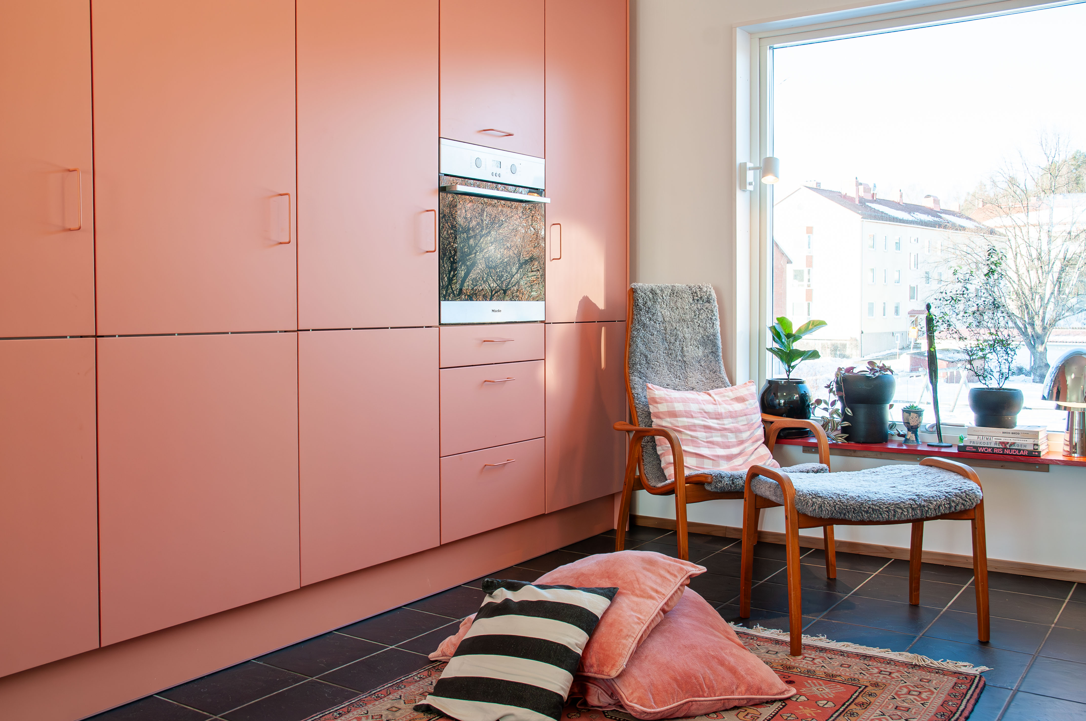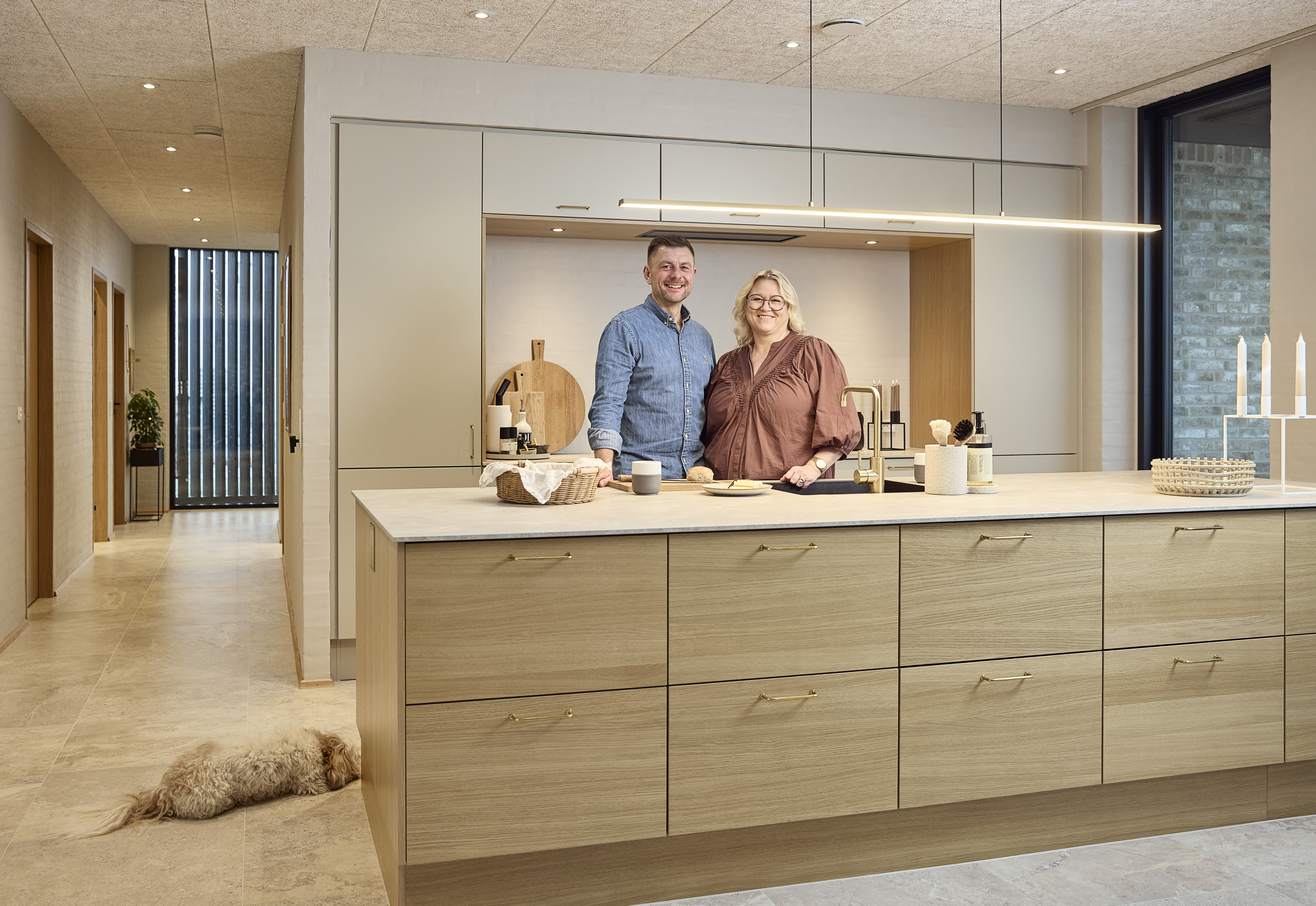 For Sofie og Mattias var det vigtigt, at køkkenet skulle afspejle deres personlighed og skabe en helhed i huset. Det fik parret skabt ved at kombinere Nordic One i farven rosamed det varme træ. Den modige rosa-farve emmer af personlighed og kombineret med Nordic One i egetræsfinéren giver det hjemmet varme og sjæl.