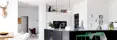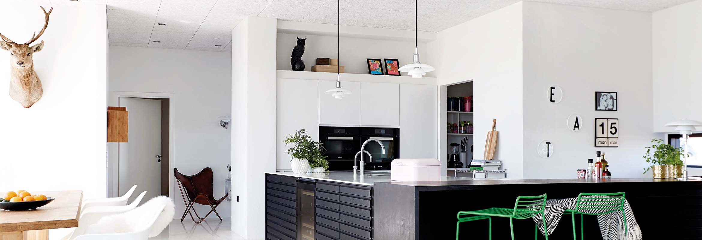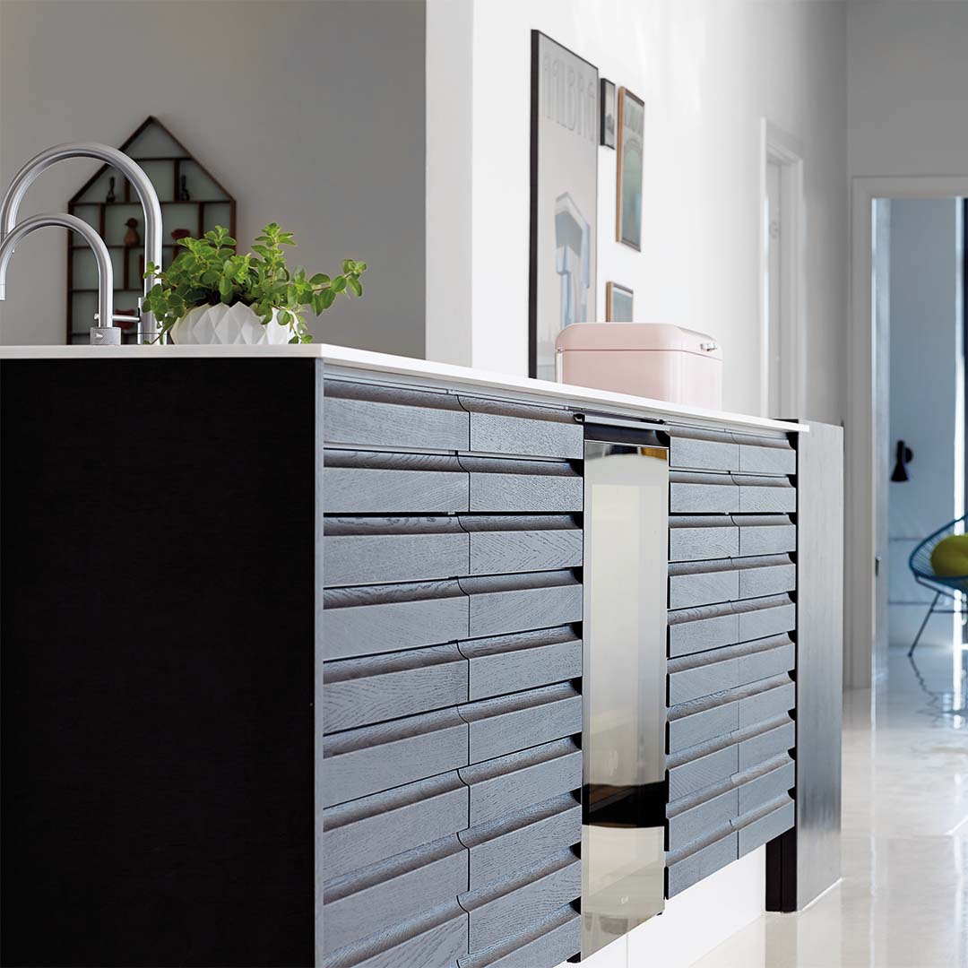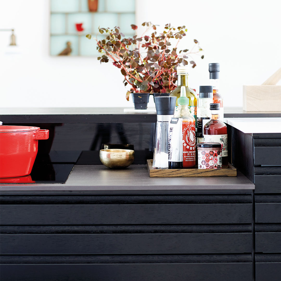 Køkkenet er bygget op omkring modellerne Nordic Multifront og Nordic Inline. De sorte multifronter i egetræ står i skarp kontrast til Nordic Inlines lyse og stilrene fremtoning. Tilsammen skaber de kontrastfulde modsætninger mellem sort og hvidt, det massive og det lette - et designerkøkken hvor håndværk og snedkerkvalitet parres med det moderne og funktionelle.