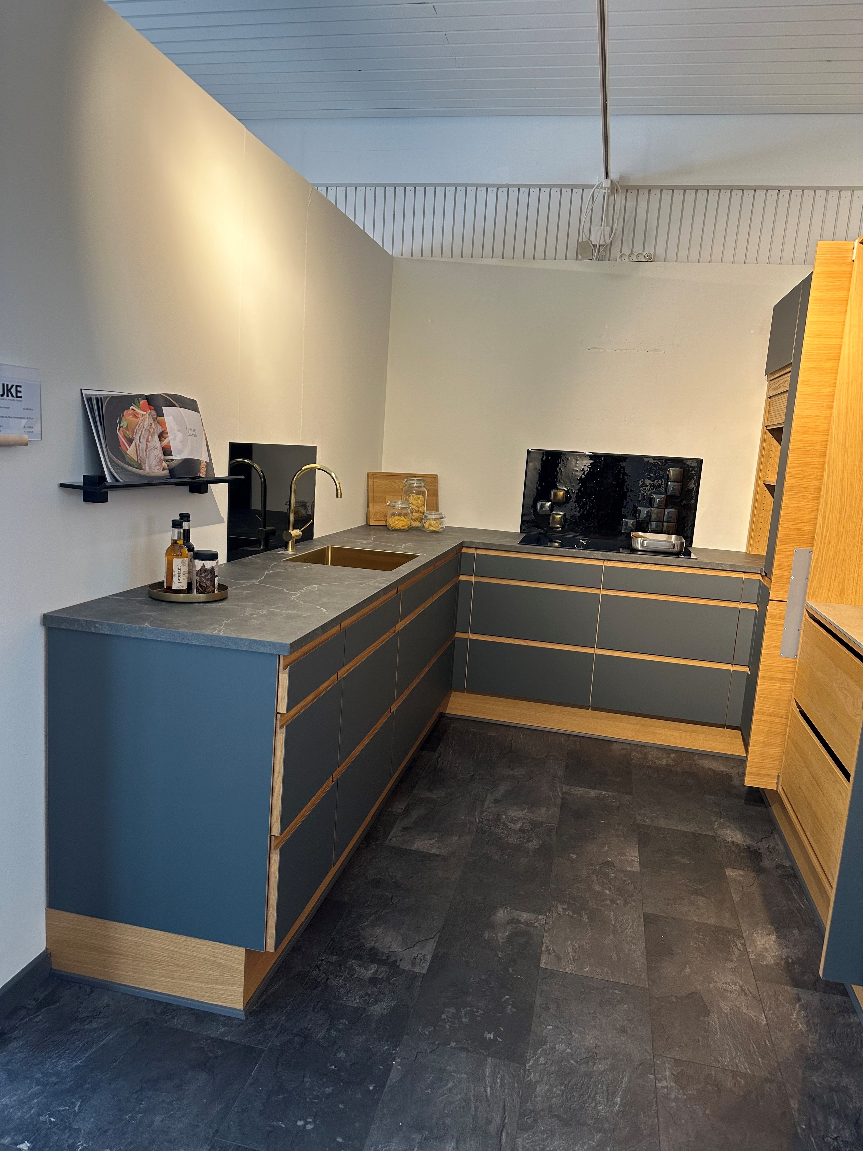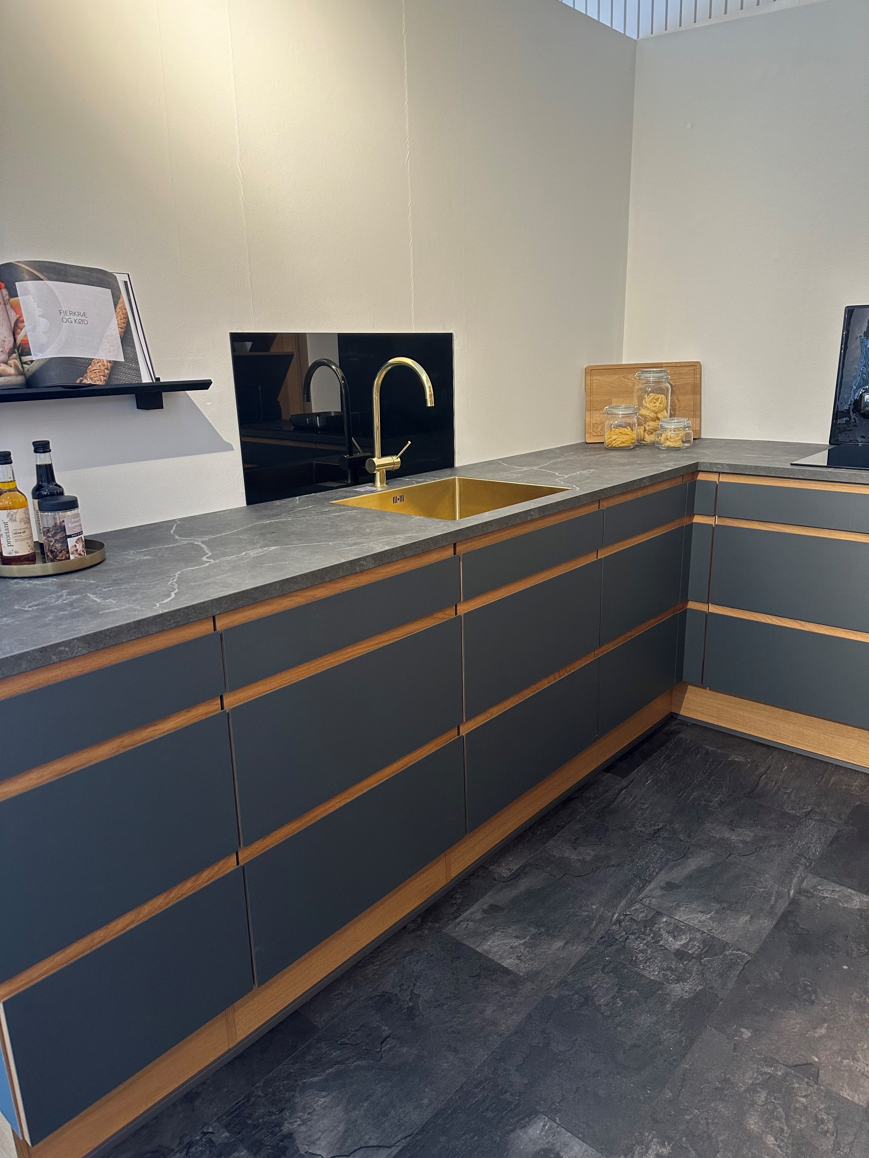 Bordplade 30 mm laminat 2384. Vask Lavabo Kubus 500 messing coating. Elementer, bordplade og vask (ekskl. hvidevarer, stænkpanel og armatur).