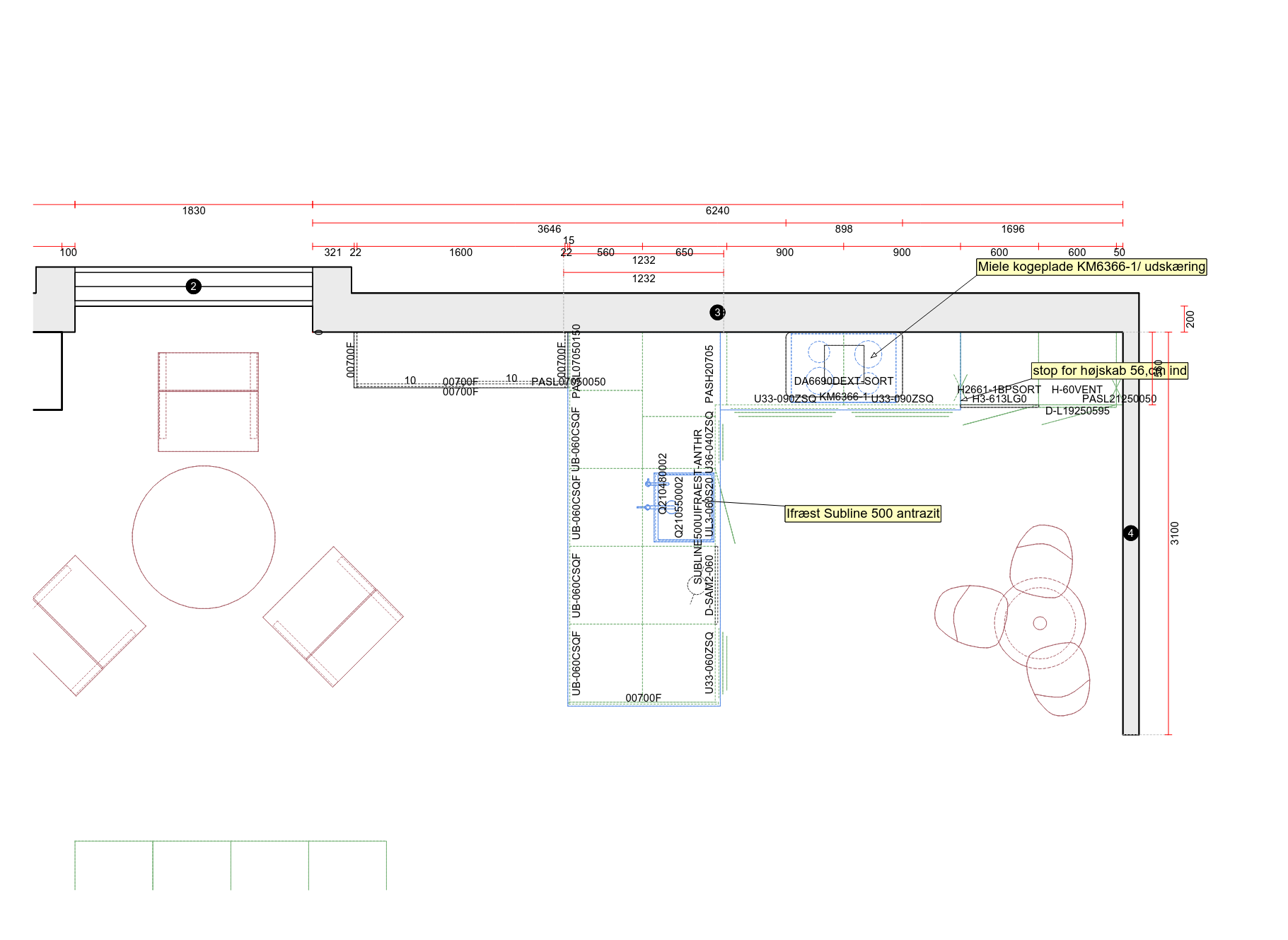 Flot køkken med linoleums fronter, Craft skuffer og naturstensbordplade.